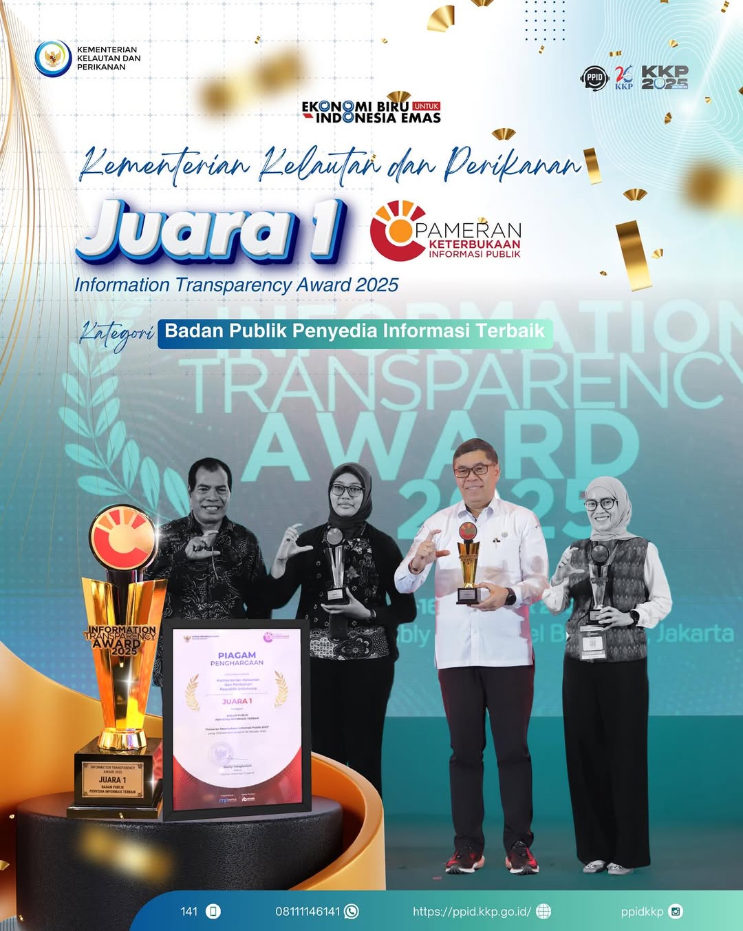 🏆 Kementerian Kelautan dan Perikanan meraih Juara 1 Information Transparency Award 2025 dalam Kategori Badan Publik Penyedia Informasi Terbaik pada Pameran Keterbukaan Informasi Publik 2025.