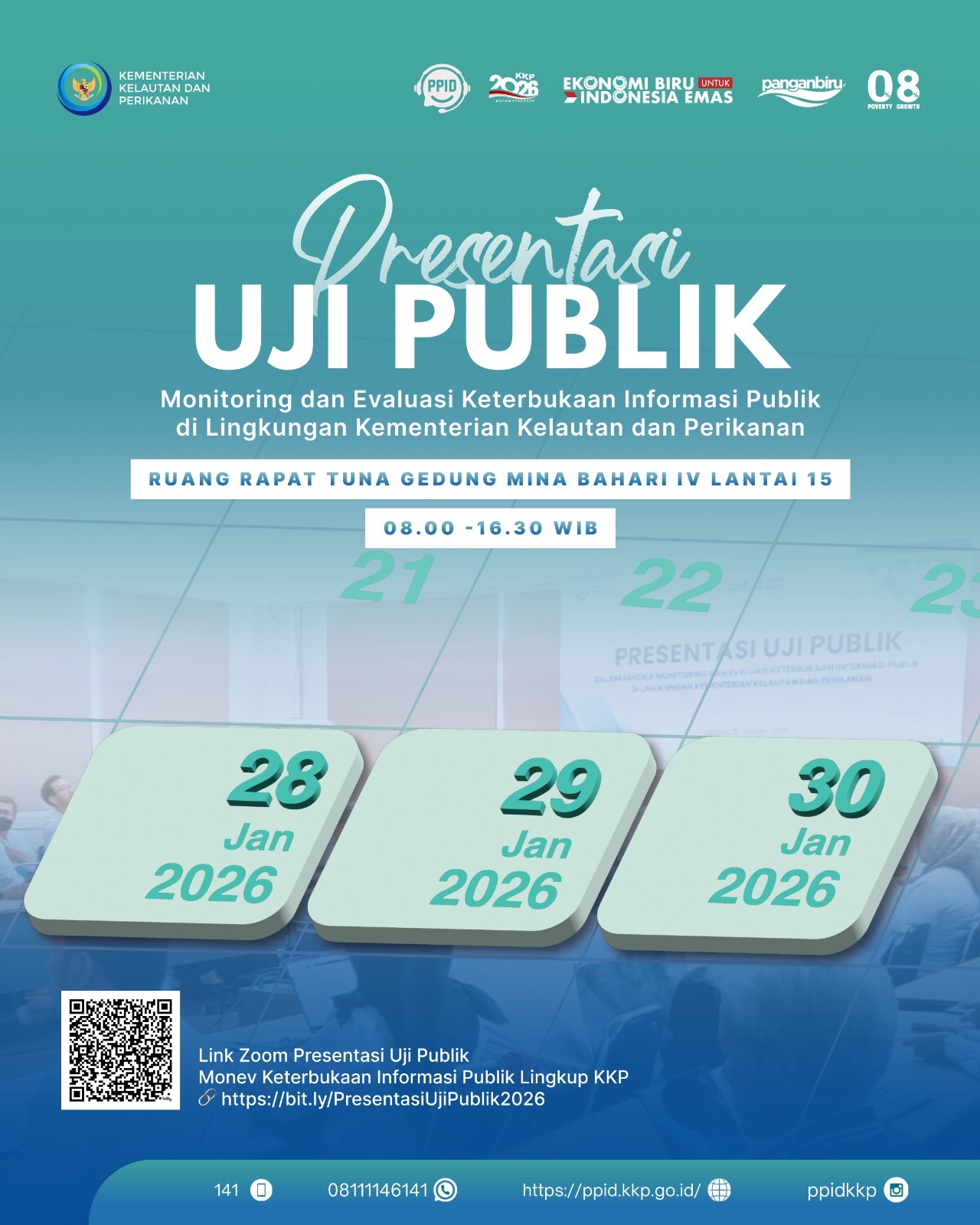 PPID Kementerian Kelautan dan Perikanan akan menyelenggarakan Presentasi Uji Publik yang merupakan bagian dari Tahapan Monev Keterbukaan Informasi Publik Lingkup KKP dan sebagai wujud komitmen KKP dalam mewujudkan tata kelola pemerintahan yang transparan, akuntabel, dan partisipatif.