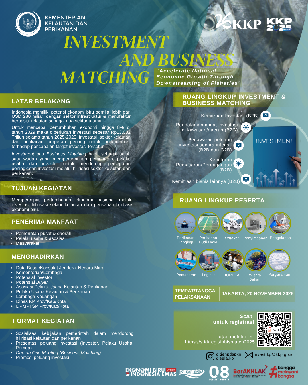Kementerian Kelautan dan Perikanan (KKP) akan menyelenggarakan Investment and Business Matching dengan tema “Accelerate National Economic Growth Through Downstreaming of Fisheries” pada bulan November 2025.