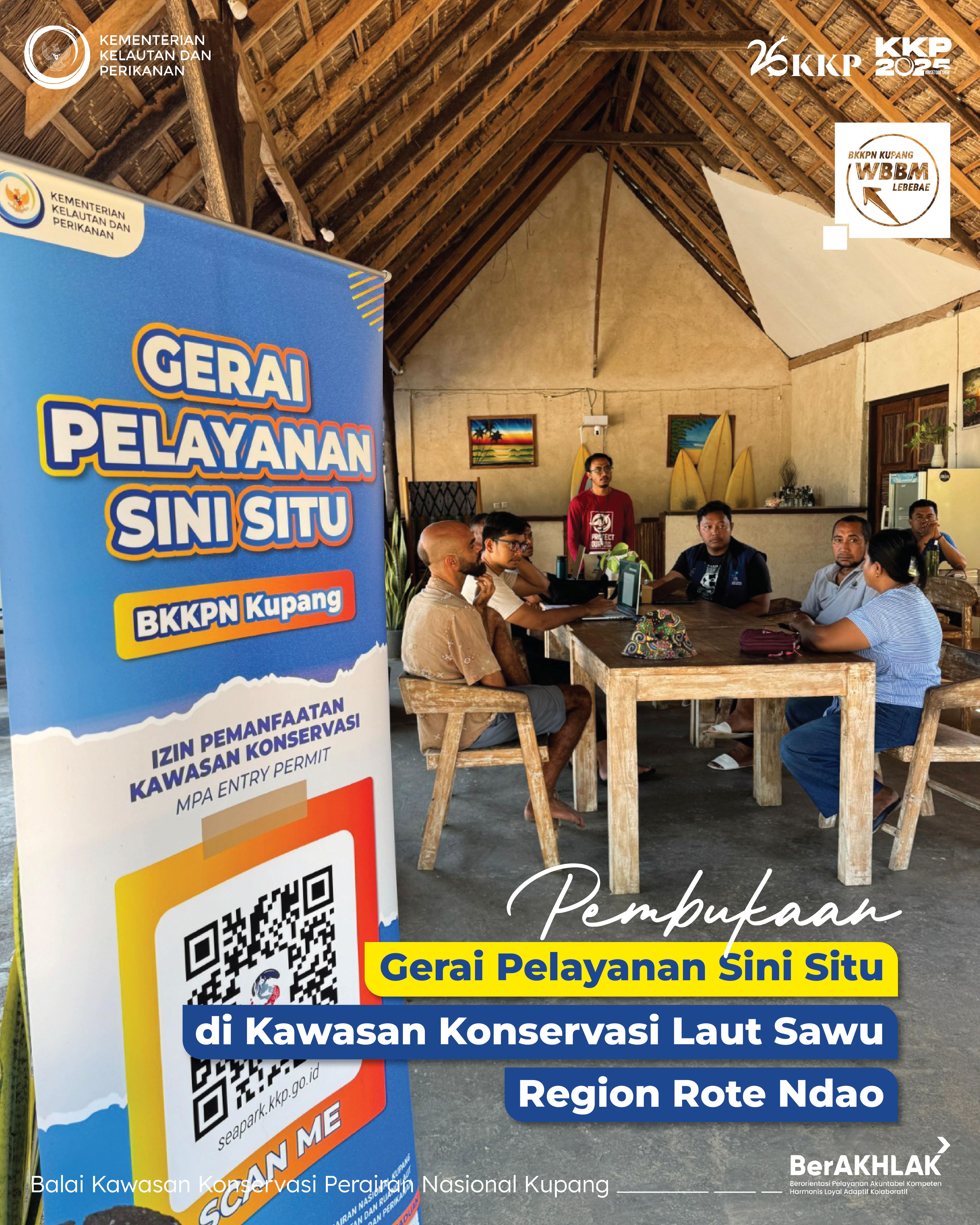 Rote Ndao, 29 September 2025 – Balai Kawasan Konservasi Perairan Nasional (BKKPN) Kupang membuka Gerai Pelayanan “Sini Situ Perizinan Pemanfaatan Kawasan Konservasi Taman Nasional Perairan Laut Sawu” di Kecamatan Rote Barat, Kabupaten Rote Ndao, pada 25–28 September 2025.