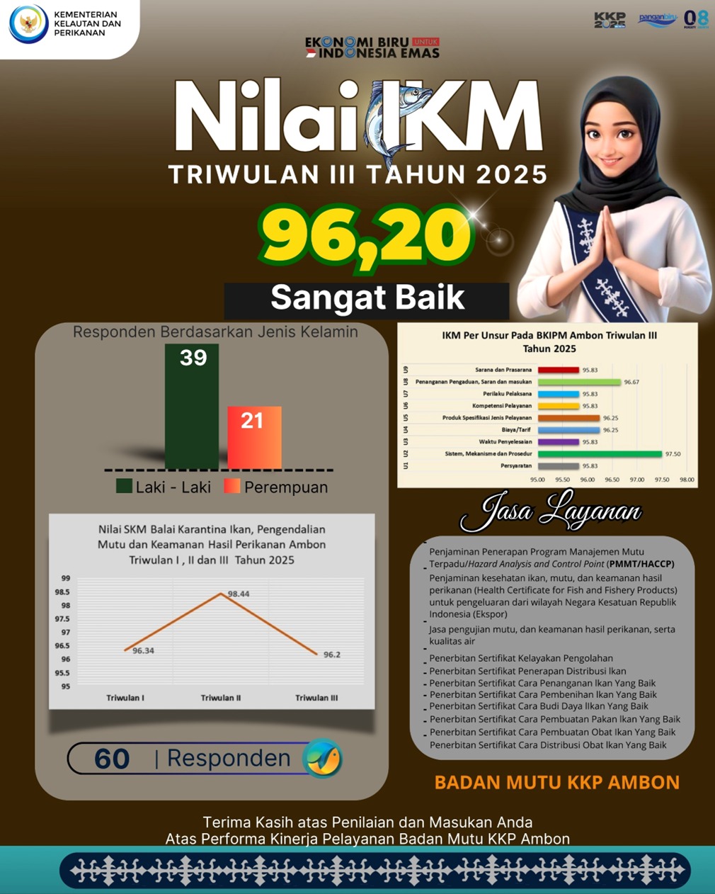 Hasil SKM pada Triwulan III Tahun 2025 menunjukkan bahwa layanan Badan Mutu KKP Maluku dipersepsikan SANGAT BAIK, dengan perolehan Indeks Kepuasan Masyarakat (IKM) sebesar 96,20 dari 60 responden.