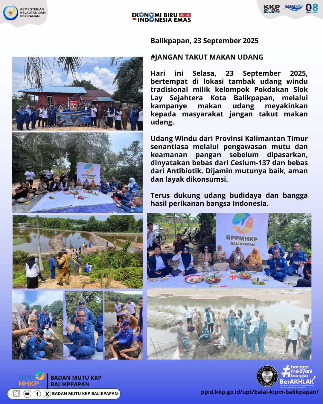 Hari ini Selasa, 23 September 2025, bertempat di lokasi tambak udang windu tradisional milik kelompok Pokdakan Slok Lay Sejahtera Kota Balikpapan, melalui kampanye makan udang meyakinkan kepada masyarakat jangan takut makan udang.