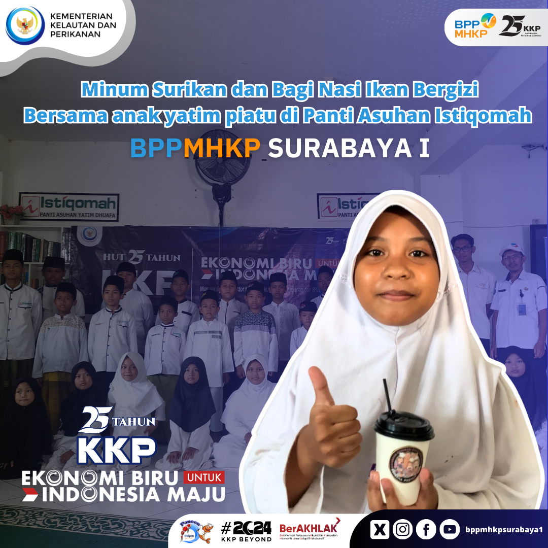 Masih dalam rangka ulang tahun Kementerian Kelautan dan Perikanan (KKP) yang ke-25, BPPMHKP Surabaya I melaksanakan kegiatan minum susu ikan dan juga membagikan nasi ikan bergizi kepada anak yatim piatu Istiqomah berjumlah 50 anak.