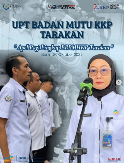 Senin, (20/10) - Apel Pagi di lingkungan UPT Badan Mutu KKP Tarakan , Kalimantan Utara. Kegiatan ini dipimpin langsung oleh Plt. Kepala UPT Badan Mutu KKP Tarakan, serta diikuti oleh seluruh pegawai, serta siswa PKL dari SMKN 3 Tarakan dan mahasiswa dari Politeknik Nunukan. Kegiatan Apel Pagi berlangsung dengan lancar dan tertib.