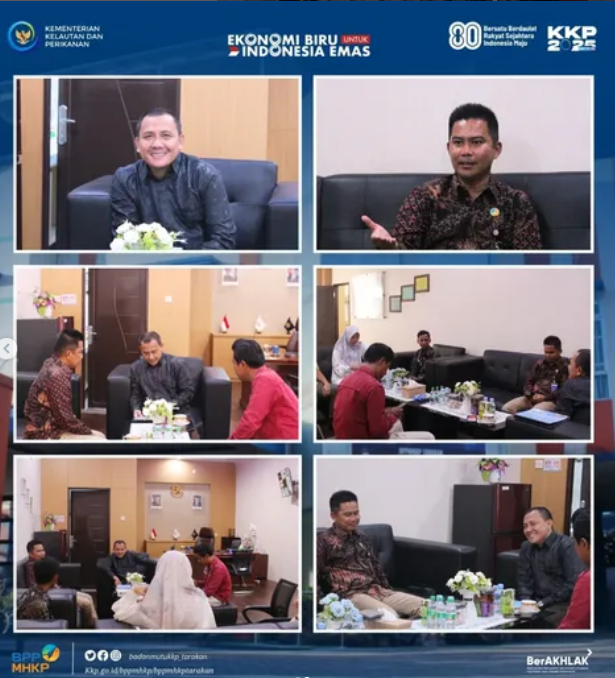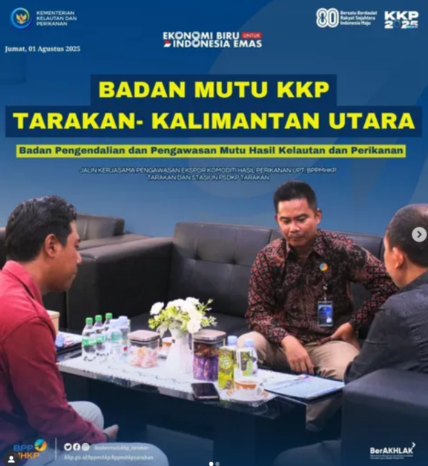 Jumat, (01/08) - Plt. Kepala Badan Mutu KKP Tarakan Kalimantan Utara bersama Kepala Stasiun PSDKP Tarakan, berkomitmen bersama menjaga Perbatasan dalam hal pengawasan ekspor produk perikanan yang akan diekspor melalui Kalimantan Utara. Rapat ini juga membahas terkait perizinan2 yg dimiliki oleh UPI. Selanjutnya Kepala Stasiun PSDKP beserta jajaran akan melanjutkan K3 ini dengan pertemuan teknis bersama Plt. Kepala BPPMHKP pada tanggal 13 Agustus 2025 yang secara khusus akan membahas terkait penertiban perizinan Sertifikat HACCP, Penggunaan SJMKHP pada UPI di wilayah Kalimantan Utara, yg akan lebih di fokuskan pada UPI yang melakukan kegiatan ekspor tujuan Tawau (Malaysia Timur), yang mana Kalimantan Utara berbatasan langsung dgn Tawau (Malaysia Timur)