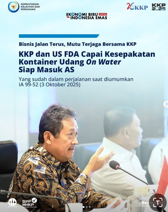 KKP dan US FDA sepakat: kontainer udang yang on water sebelum 13 Oktober 2025 tetap bisa masuk AS meski IA 99-52 sudah diumumkan.