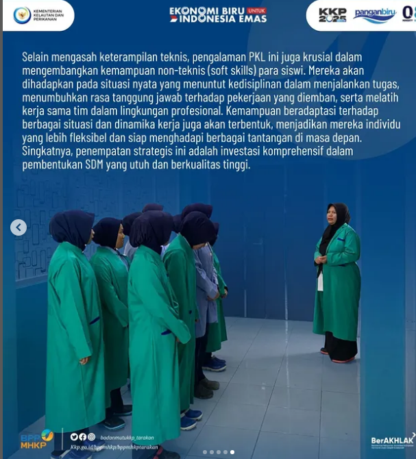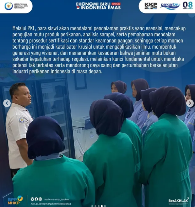 Selama PKL, para siswi akan memperoleh pengalaman praktis relevan dalam pengujian mutu produk perikanan, analisis sampel, serta pemahaman tentang prosedur sertifikasi dan standar keamanan pangan. Kesempatan ini krusial untuk mengaplikasikan teori dan memperdalam wawasan mereka mengenai pentingnya jaminan mutu di industri perikanan.