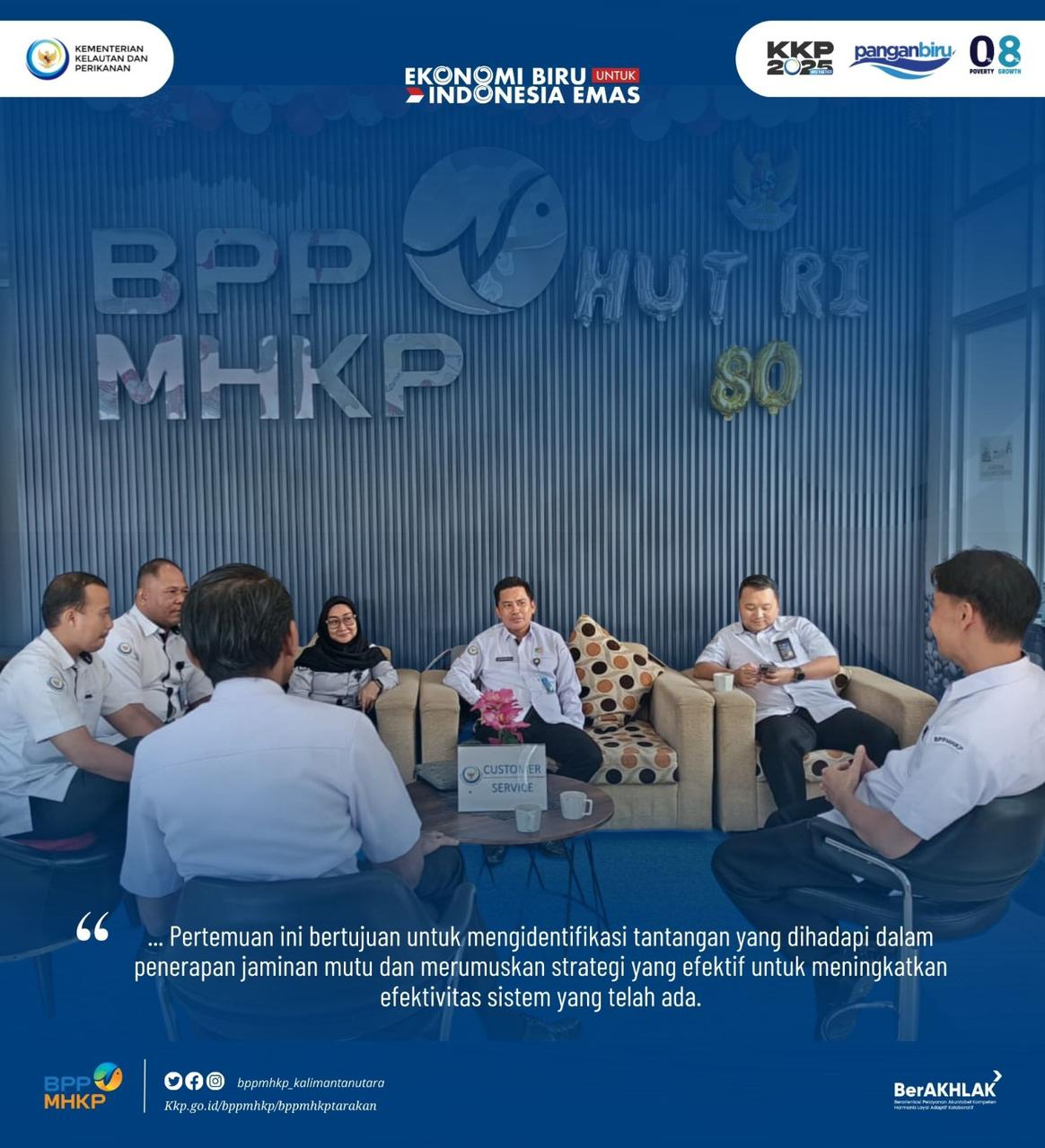 Senin (25/08) - Badan Mutu KKP Tarakan, dilaksanakan rapat internal yang berfokus pada penguatan _Sistem Jaminan Mutu dan Keamanan Hasil Perikanan_ . Rapat ini dipimpin langsung oleh Plt. Kepala Badan Mutu KKP Tarakan dan dihadiri oleh seluruh staf teknis yang memiliki tanggung jawab dalam pengawasan serta sertifikasi mutu produk perikanan. Pertemuan ini bertujuan untuk mengidentifikasi tantangan yang dihadapi dalam penerapan jaminan mutu dan merumuskan strategi yang efektif untuk meningkatkan efektivitas sistem yang telah ada.