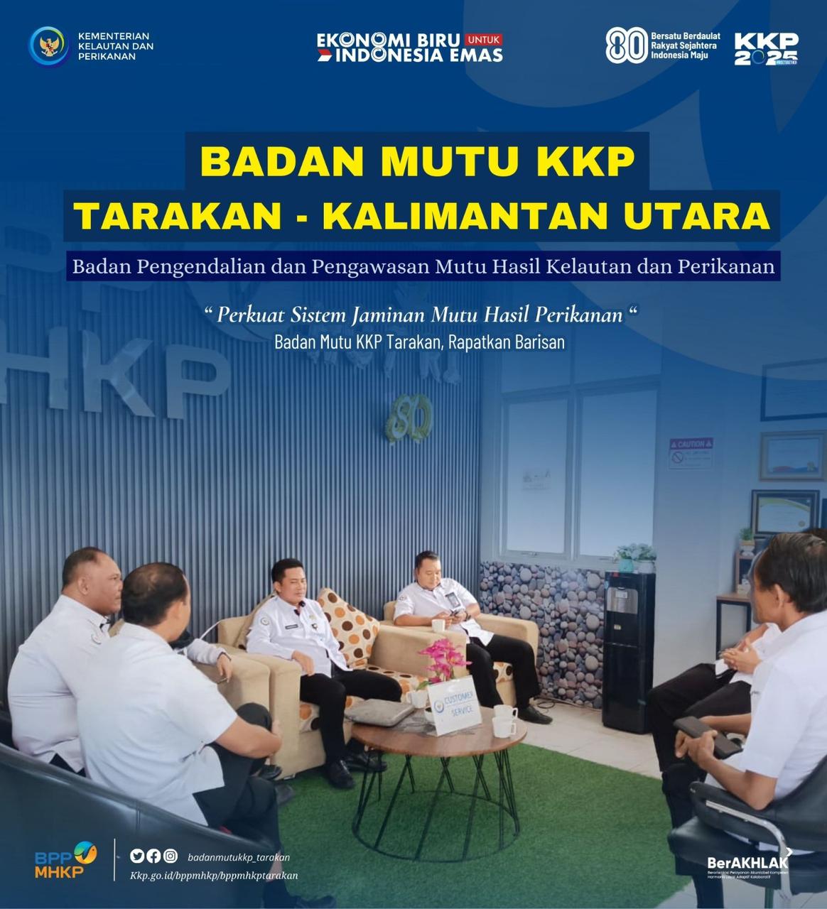 Senin (25/08) - Badan Mutu KKP Tarakan, dilaksanakan rapat internal yang berfokus pada penguatan _Sistem Jaminan Mutu dan Keamanan Hasil Perikanan_ . Rapat ini dipimpin langsung oleh Plt. Kepala Badan Mutu KKP Tarakan dan dihadiri oleh seluruh staf teknis yang memiliki tanggung jawab dalam pengawasan serta sertifikasi mutu produk perikanan. Pertemuan ini bertujuan untuk mengidentifikasi tantangan yang dihadapi dalam penerapan jaminan mutu dan merumuskan strategi yang efektif untuk meningkatkan efektivitas sistem yang telah ada.