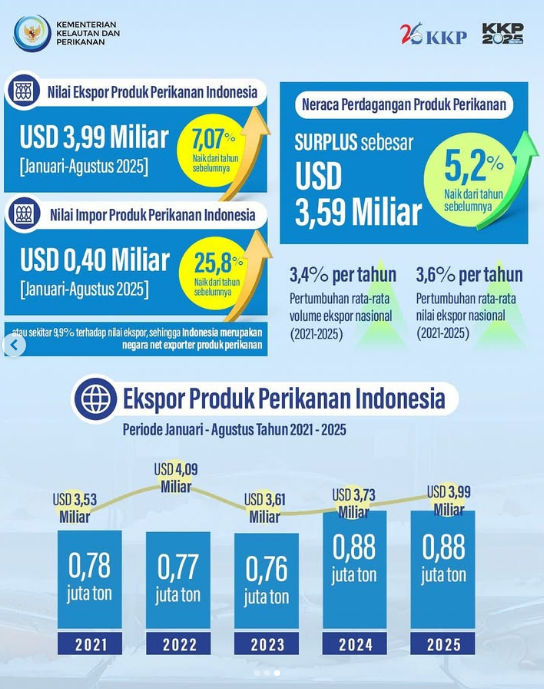 Nilai ekspor produk perikanan Indonesia periode Januari hingga Agustus 2025 ini aja bisa mencapai USD 3,99 miliar lho atau naik 7,07% dari tahun sebelumnya di periode yang sama. Lima komoditas Indonesia, diantaranya udang, tuna, cumi, kepiting, sampai rumput laut masih menduduki top komoditas ekspor nih #SahabatBahari.