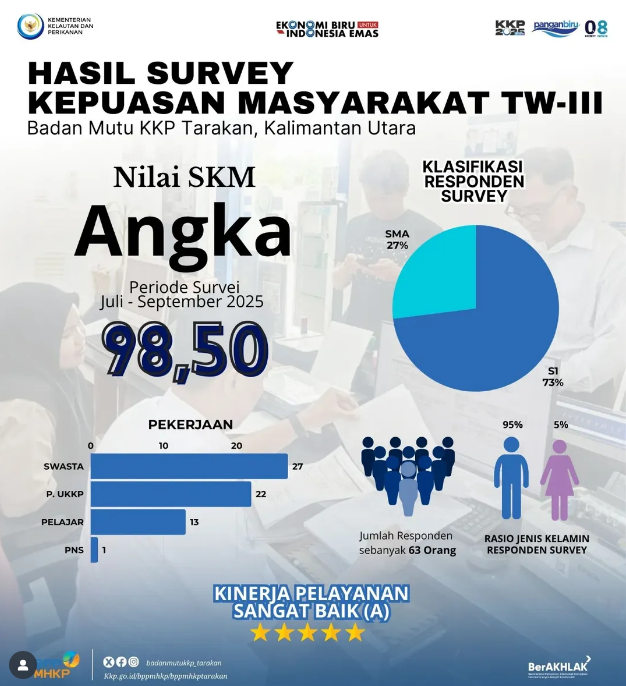 Hai #SahabatBahari🖐 Rabu, (01/10) - Hasil Survei Kepuasan Masyarakat TW-lll Periode Survei Juli-September Tahun 2025 dengan angka 98,50% (Kinerja Pelayanan Sangat Baik)