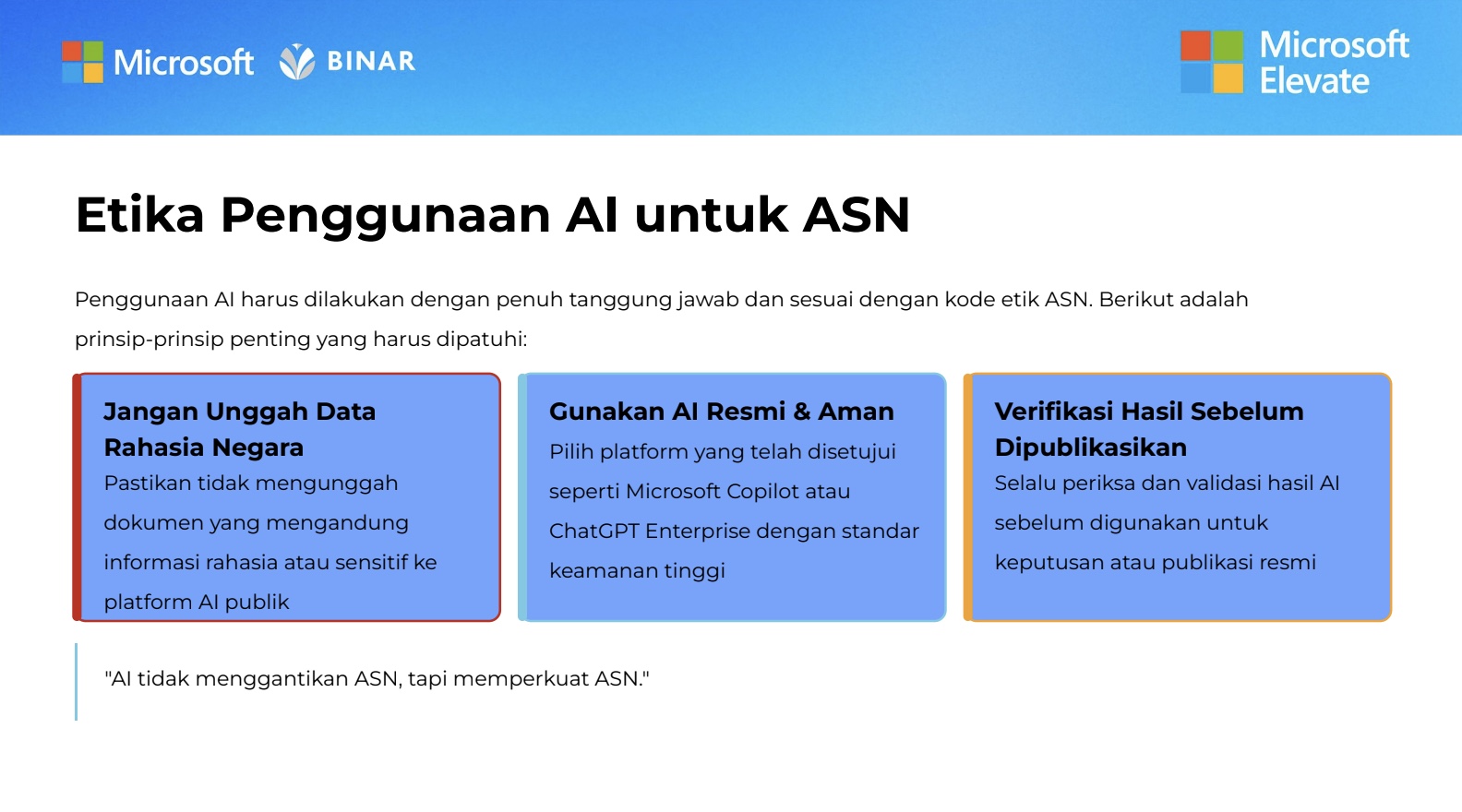 ● Perlindungan data: ASN diingatkan untuk tidak mengunggah data rahasia negara atau informasi sensitif ke platform AI publik.