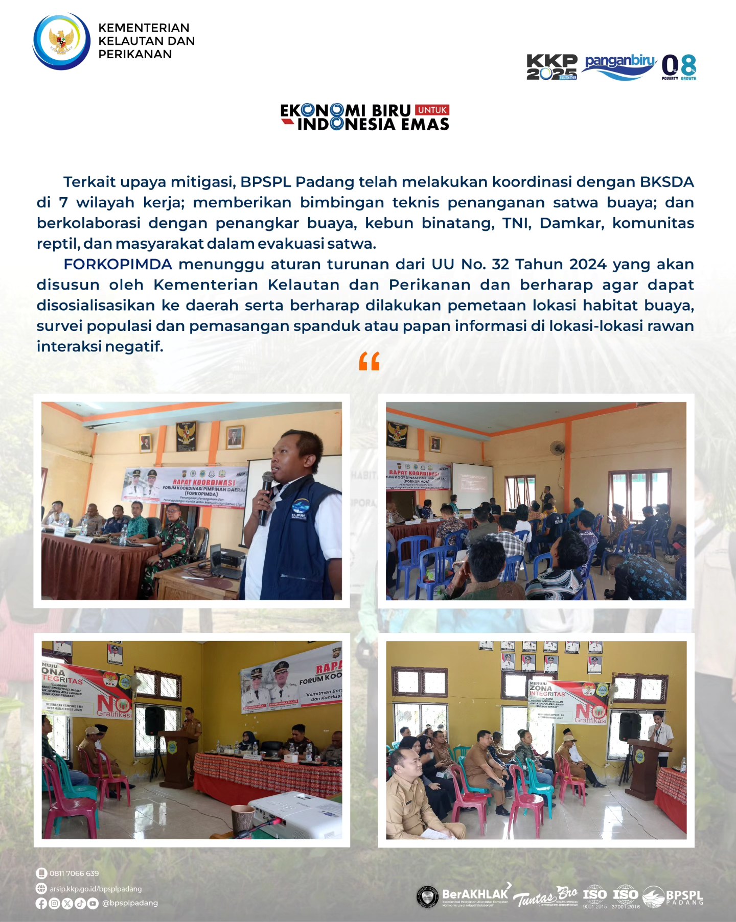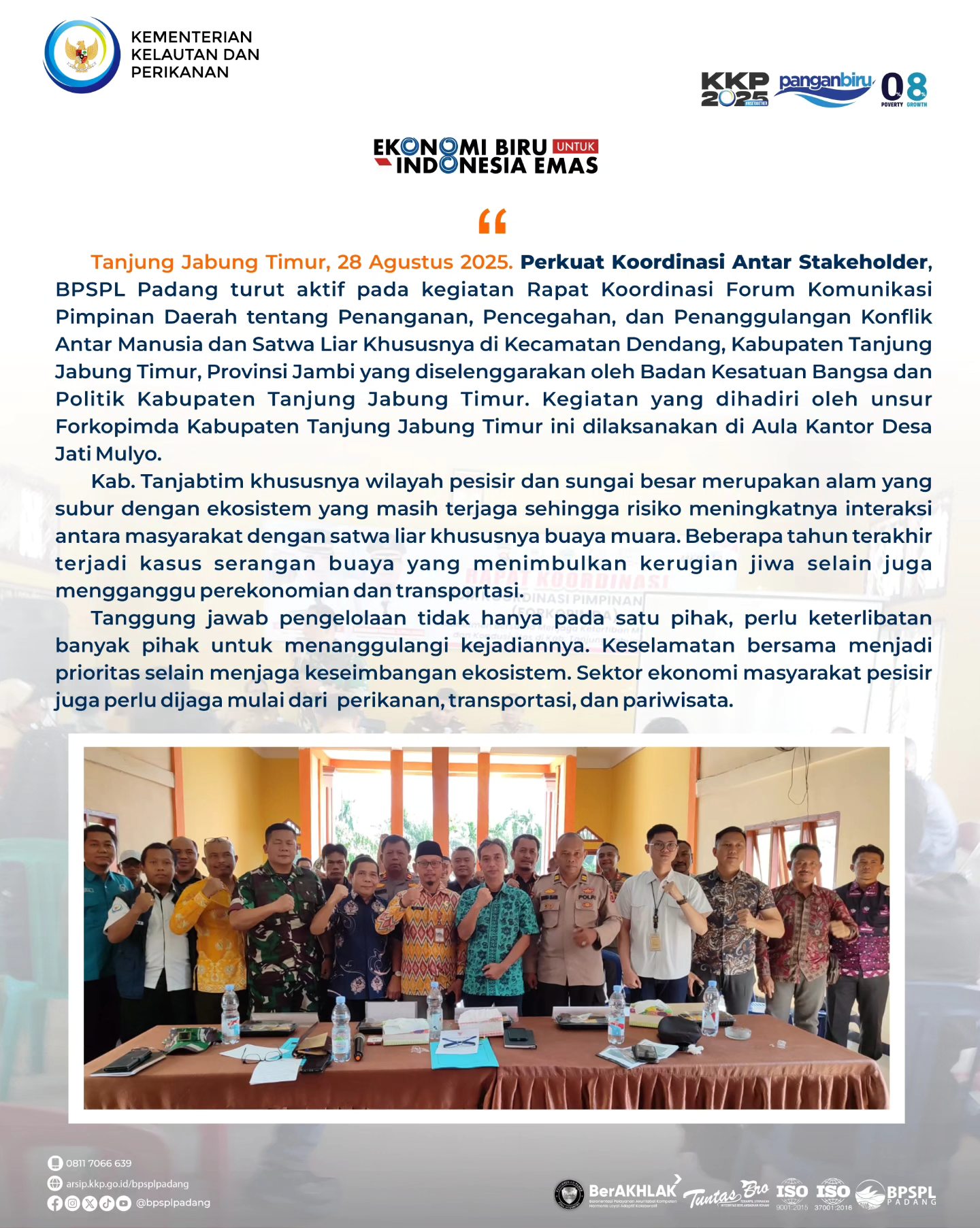 #SahabatBahari, BPSPL Padang turut aktif dalam Rapat Koordinasi (FORKOPIMDA) di Kecamatan Dendang, Tanjung Jabung Timur, membahas penanganan interaksi negatif antara manusia dan satwa liar, khususnya buaya.