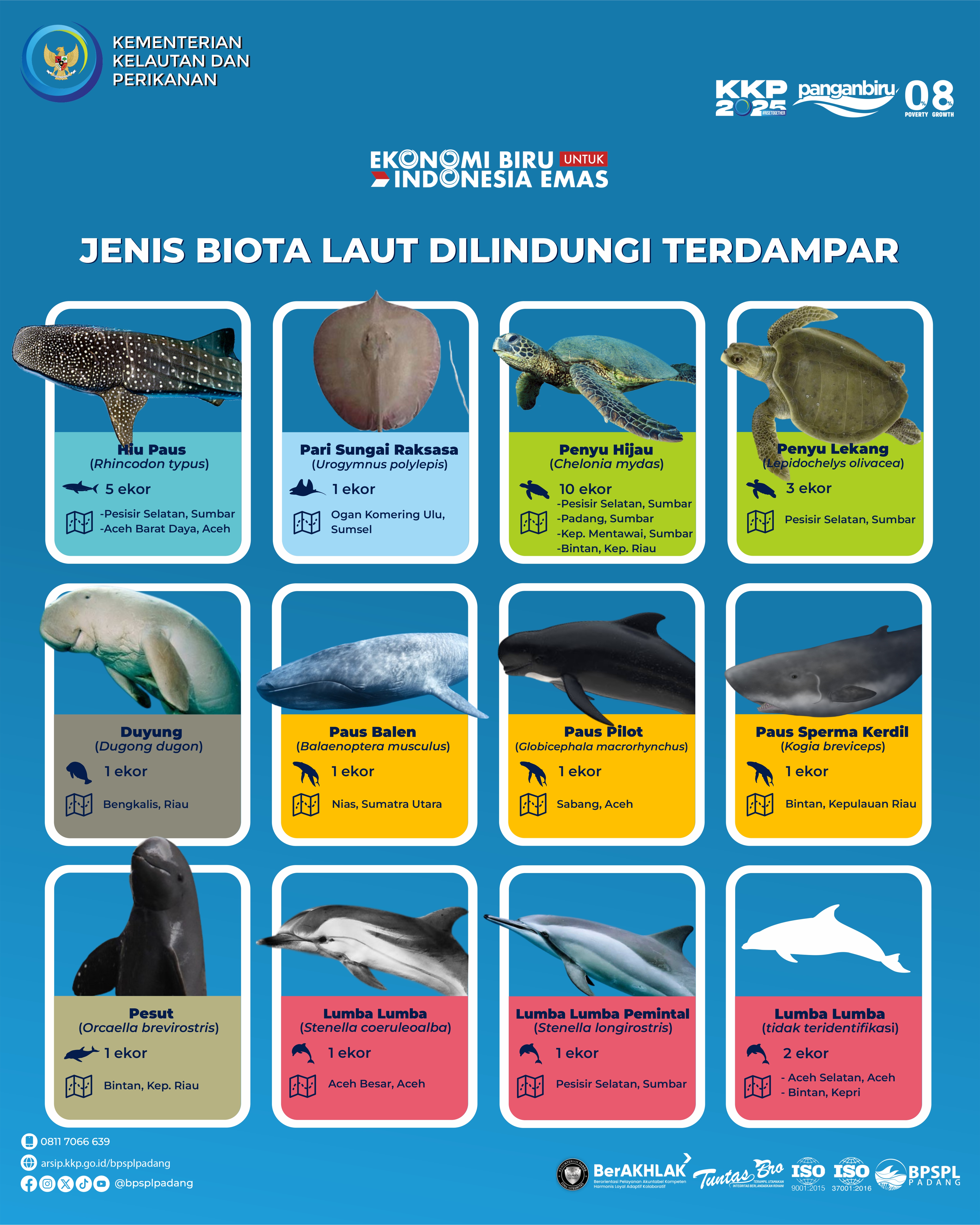 Sepanjang tahun 2024 di 7 provinsi wilayah kerja, BPSPL Padang dan tentunya bersama masyarakat telah menangani 26 kejadian biota laut dilindungi terdampar yang terdiri dari 28 jenis biota.