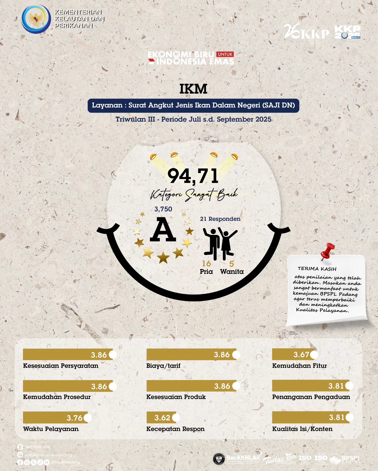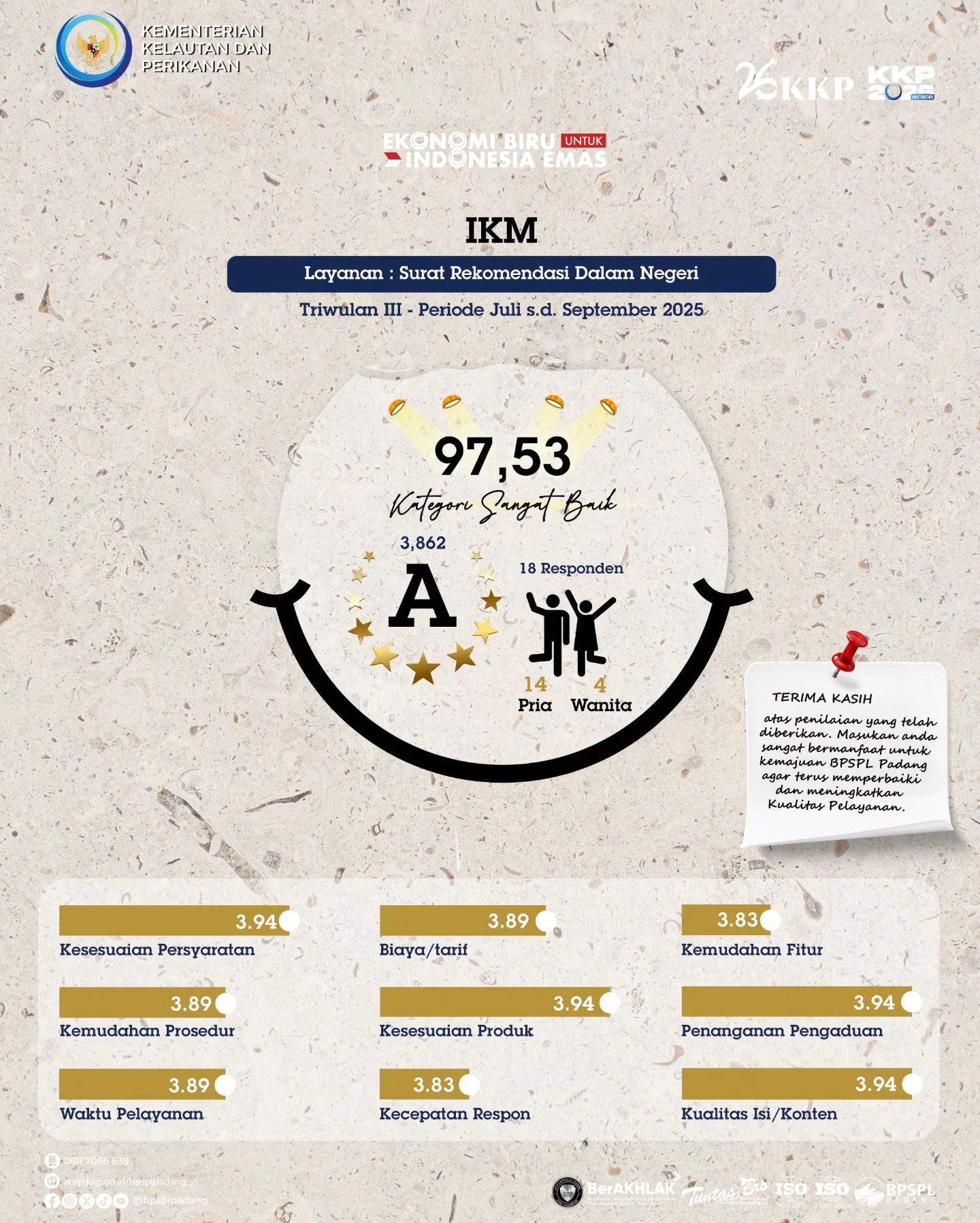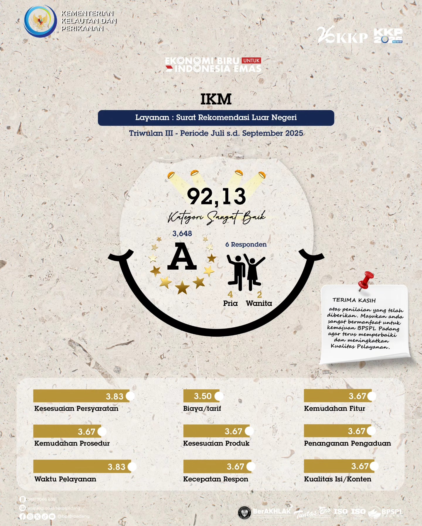 Triwulan III tahun 2025 berhasil dilalui, usaha memang tidak pernah mengkhianati hasil. Begitupun dengan usaha kami untuk terus memberikan pelayanan prima telah terbayar dengan hasil Survei Kepuasaan Masyarakat (#SKM) BPSPL Padang pada triwulan ini memperoleh nilai kumulatif sebesar 95,49 atau masuk kategori "Sangat Baik" dalam penyelenggaraan pelayanan perizinan pemanfaatan jenis ikan dilindungi dan atau Appendiks CITES berupa Penerbitan SAJI-DN dan Rekomendasi.