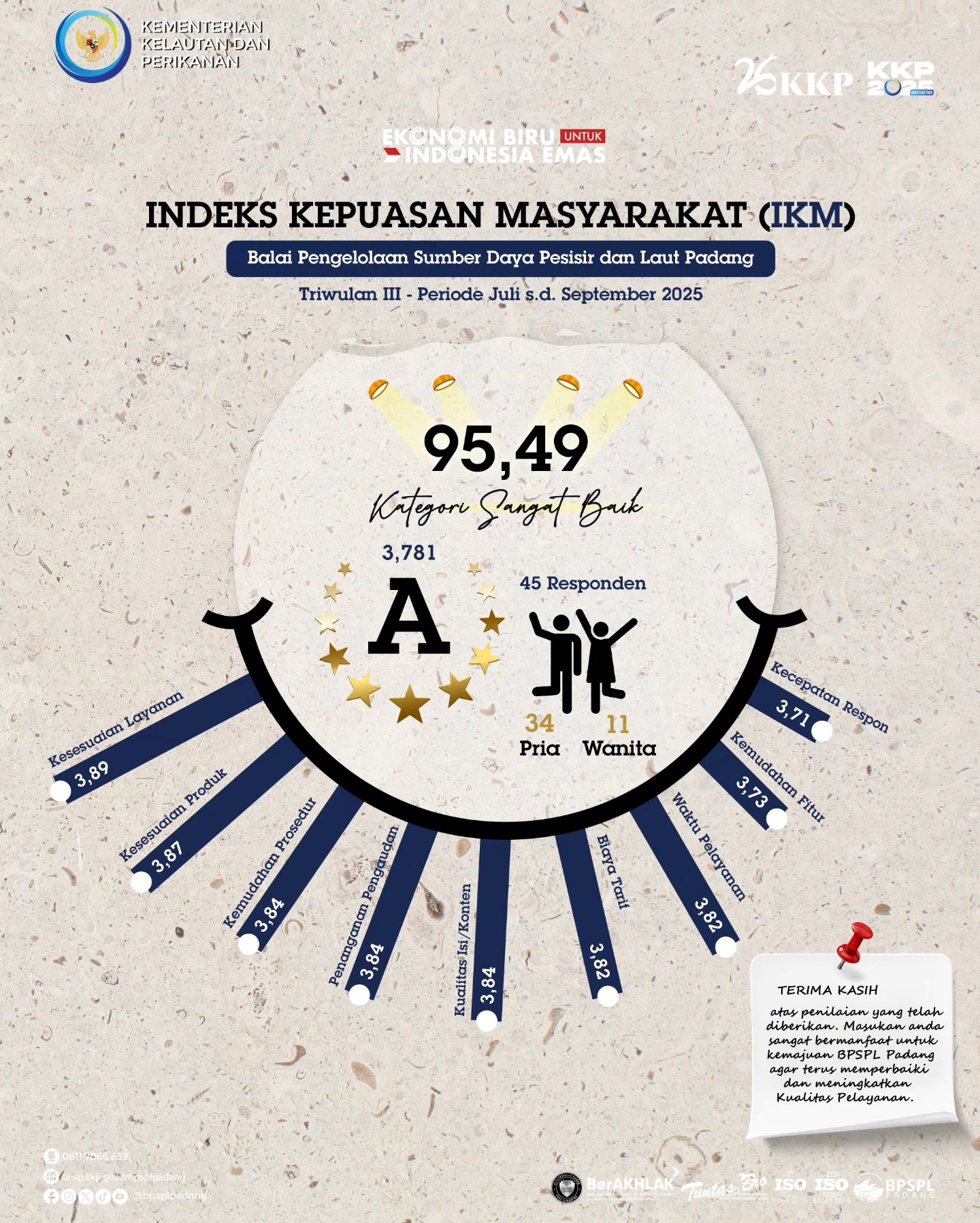 Triwulan III tahun 2025 berhasil dilalui, usaha memang tidak pernah mengkhianati hasil. Begitupun dengan usaha kami untuk terus memberikan pelayanan prima telah terbayar dengan hasil Survei Kepuasaan Masyarakat (#SKM) BPSPL Padang pada triwulan ini memperoleh nilai kumulatif sebesar 95,49 atau masuk kategori "Sangat Baik" dalam penyelenggaraan pelayanan perizinan pemanfaatan jenis ikan dilindungi dan atau Appendiks CITES berupa Penerbitan SAJI-DN dan Rekomendasi.
