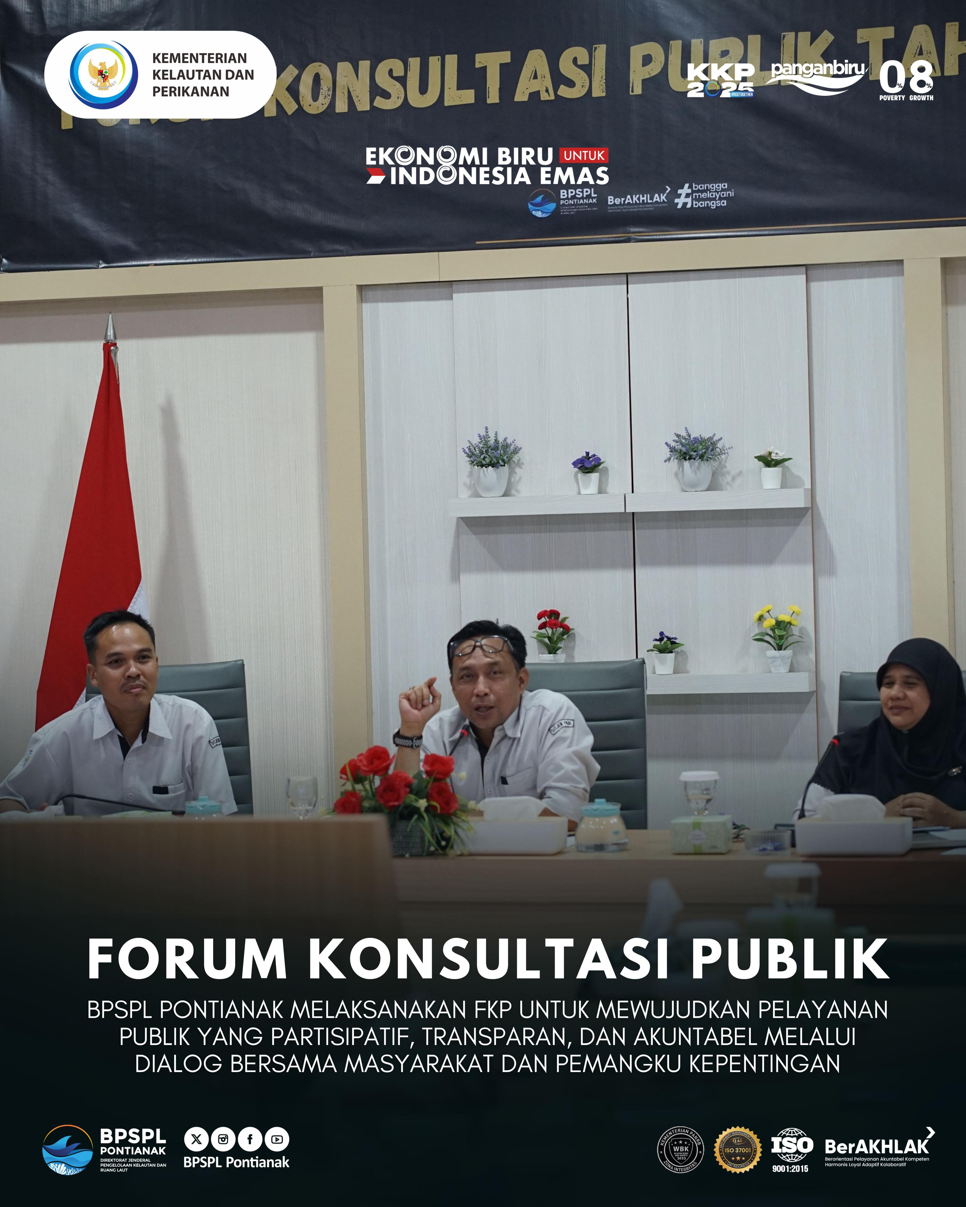 Senin, 21 Juli 2025 BPSPL Pontianak menyelenggarakan Forum Konsultasi Publik (FKP) sebagai bentuk nyata komitmen dalam meningkatkan kualitas pelayanan publik melalui pelibatan aktif masyarakat.