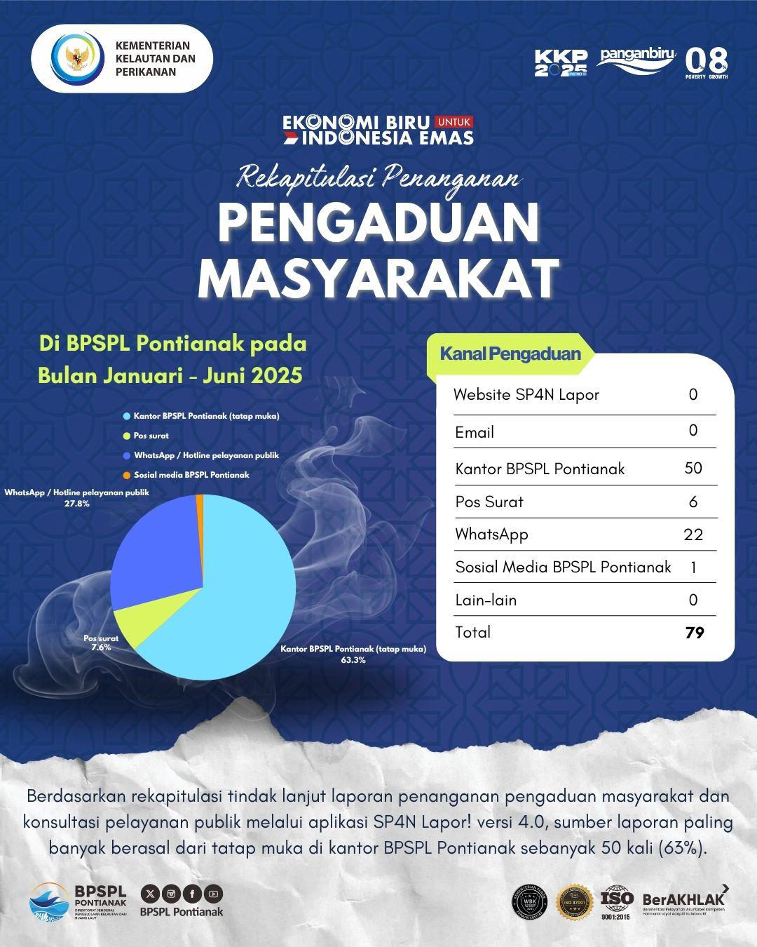 BPSPL Pontianak berkomitmen untuk terus memberikan pelayanan publik yang terbuka, responsif, dan akuntabel. Sepanjang Januari hingga Juni 2025, tercatat 79 laporan pengaduan dan konsultasi masyarakat telah diterima dan ditindaklanjuti melalui berbagai kanal.