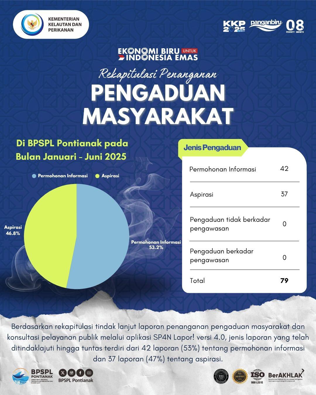 BPSPL Pontianak berkomitmen untuk terus memberikan pelayanan publik yang terbuka, responsif, dan akuntabel. Sepanjang Januari hingga Juni 2025, tercatat 79 laporan pengaduan dan konsultasi masyarakat telah diterima dan ditindaklanjuti melalui berbagai kanal.