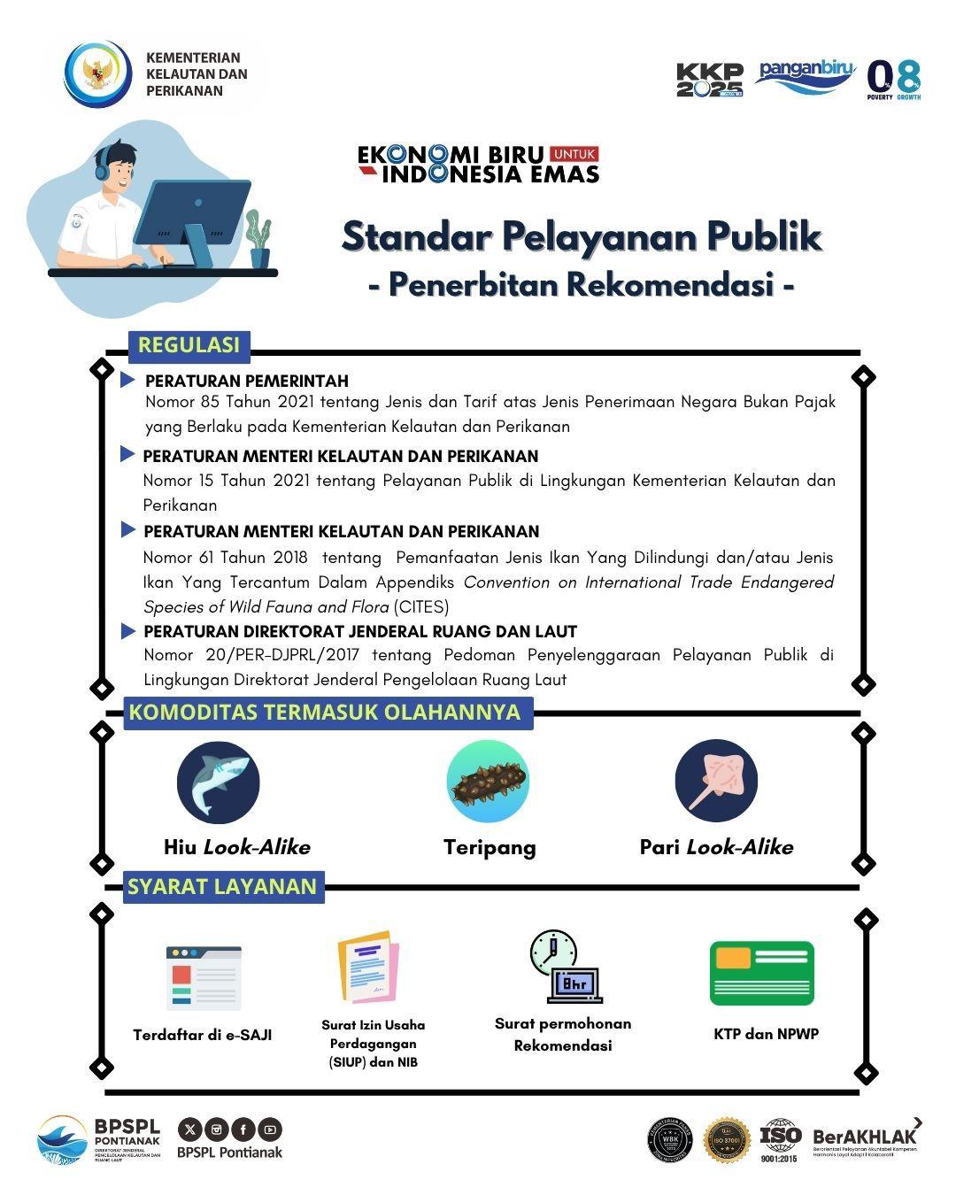 Dalam rangka meningkatkan kualitas pelayanan publik di bidang pengelolaan dan pemanfaatan sumber daya kelautan, Balai Pengelolaan Sumber Daya Pesisir dan Laut (BPSPL) Pontianak menetapkan Standar Pelayanan Publik untuk penerbitan Surat Rekomendasi Pemanfaatan Jenis Ikan Look-Alike Species. Standar ini menjadi pedoman bagi pelaksana dan masyarakat dalam memastikan bahwa kegiatan pemanfaatan jenis ikan yang memiliki kemiripan dengan spesies dilindungi dan atau masuk Appendiks CITES dilaksanakan secara tertib, transparan, dan sesuai ketentuan peraturan perundang-undangan.