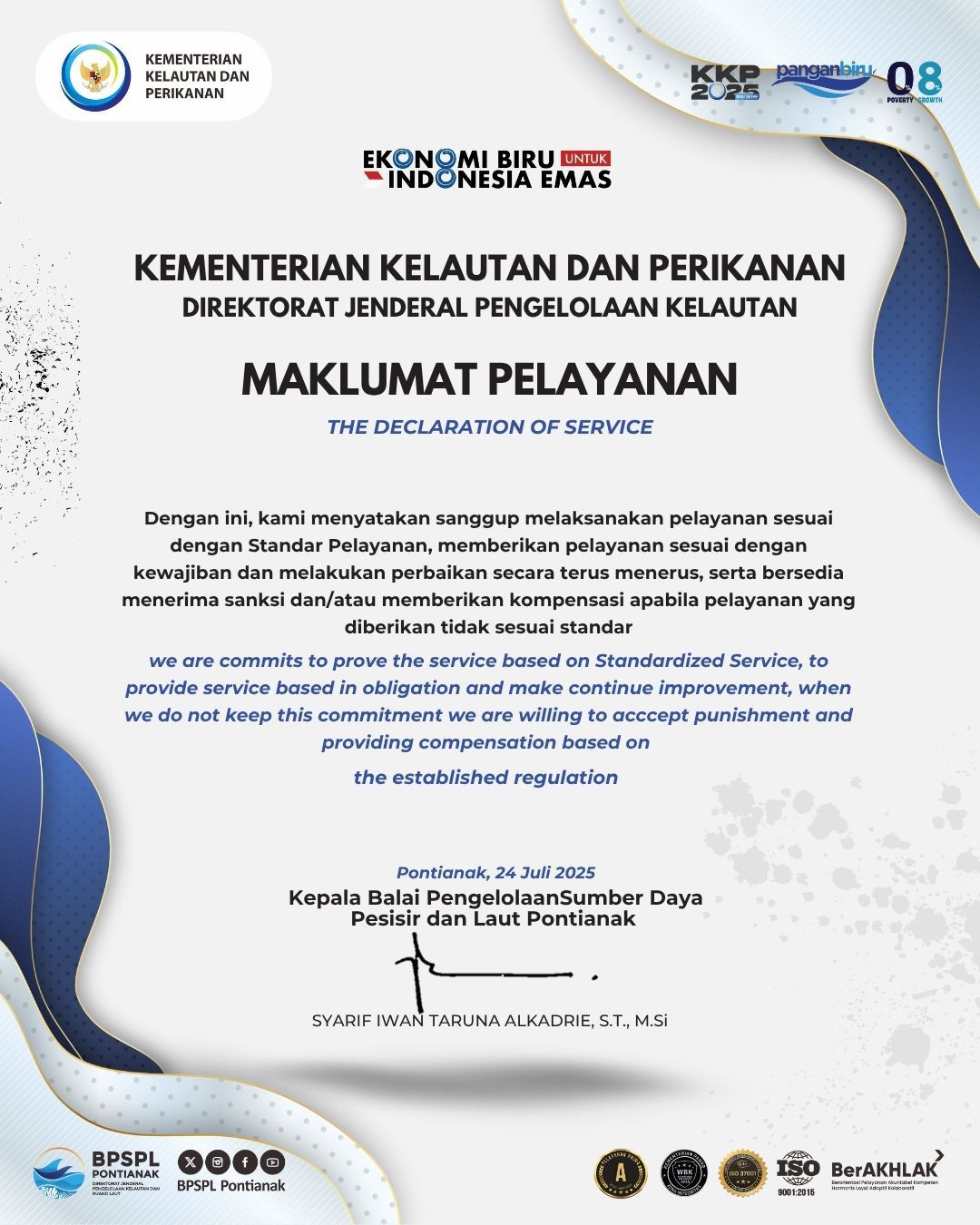 Sebagai wujud komitmen terhadap pelayanan publik yang berkualitas, BPSPL Pontianak menyatakan siap memberikan pelayanan sesuai Standar Pelayanan yang telah ditetapkan. 📜 Dalam Maklumat Pelayanan ini, kami menegaskan kesanggupan untuk terus melakukan perbaikan, memberikan pelayanan terbaik, serta menerima sanksi dan/atau memberikan perbaikan apabila pelayanan tidak sesuai standar. Mari bersama mewujudkan pelayanan publik yang Profesional, Amanah, Santun, Terdepan, dan Inovatif (PASTI) demi pengelolaan sumber daya pesisir dan laut yang berkelanjutan!