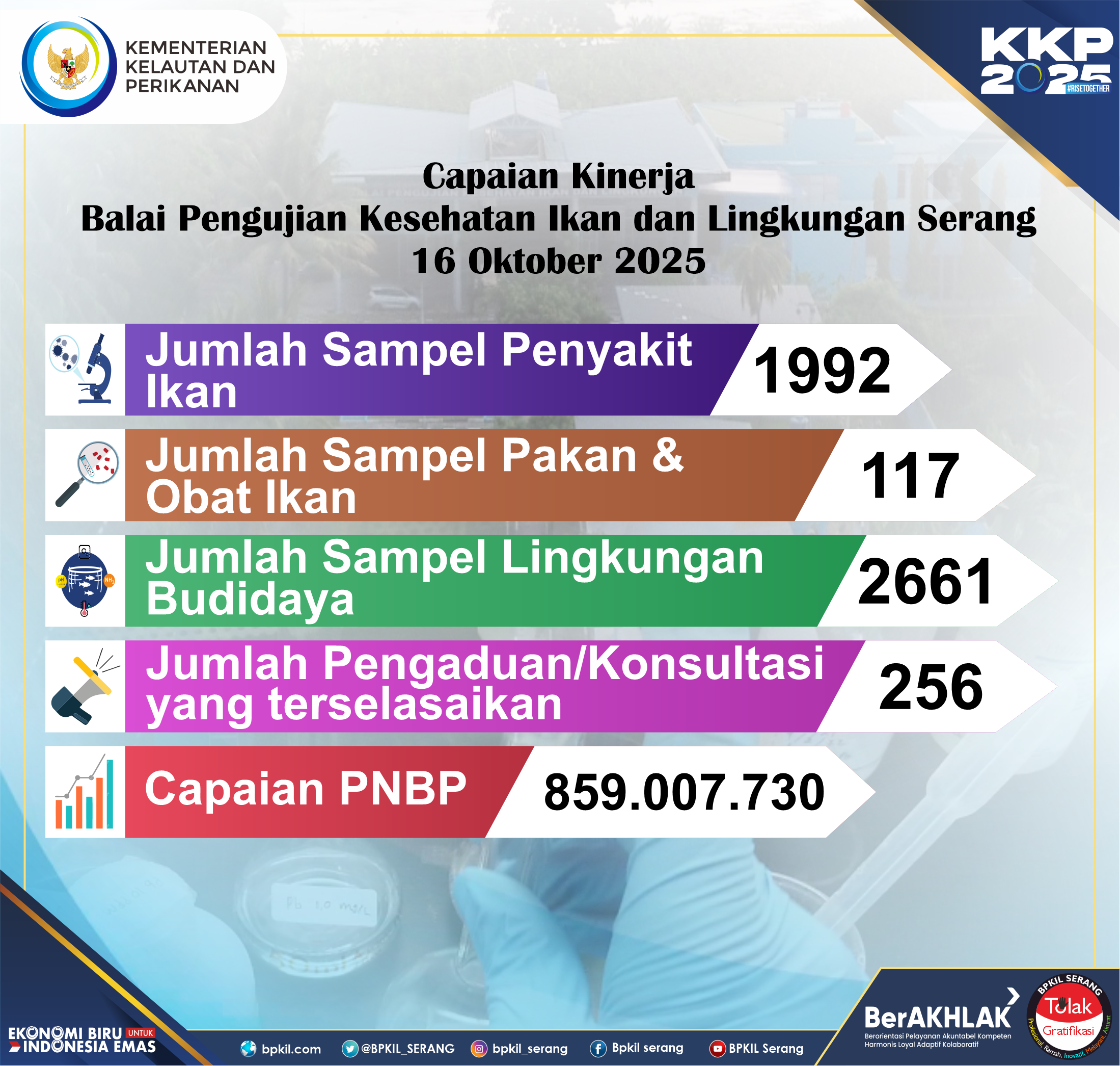 Berikut adalah Infografis Capaian Kinerja BPKIL Serang s.d 16 Oktober 2025 terkait Pengujian Sampel Penyakit Ikan, Lingkungan Budidaya, Pakan dan Obat Ikan, Jumlah pengaduan / konsultasi yang terselesaikan, serta Capaian PNBP