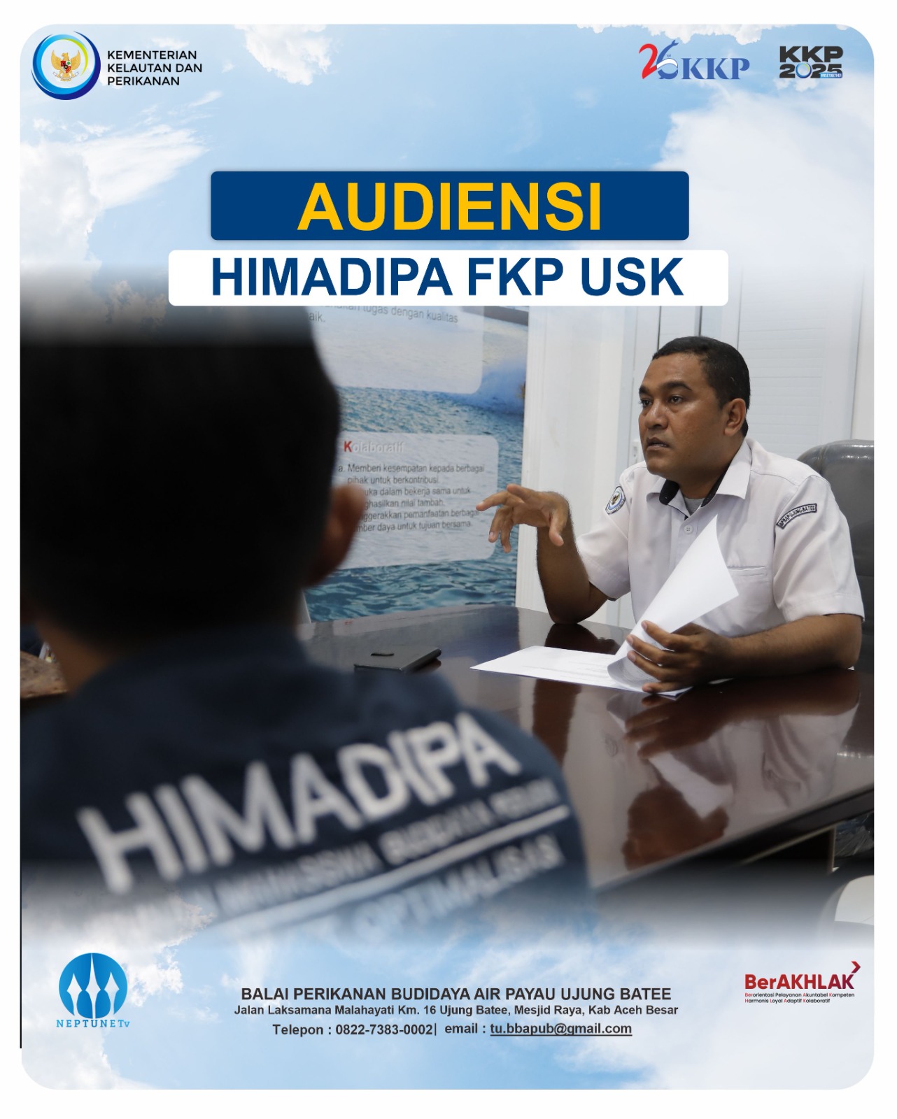 Balai Perikanan Budidaya Air Payau (BPBAP) Ujung Batee menerima kunjungan dari Himpunan Mahasiswa Budidaya Perairan (HIMADIPA) Universitas Syiah Kuala. Kunjungan ini bertujuan untuk melakukan audiensi sekaligus mendapatkan informasi terkait program serta kegiatan yang dilaksanakan di balai.