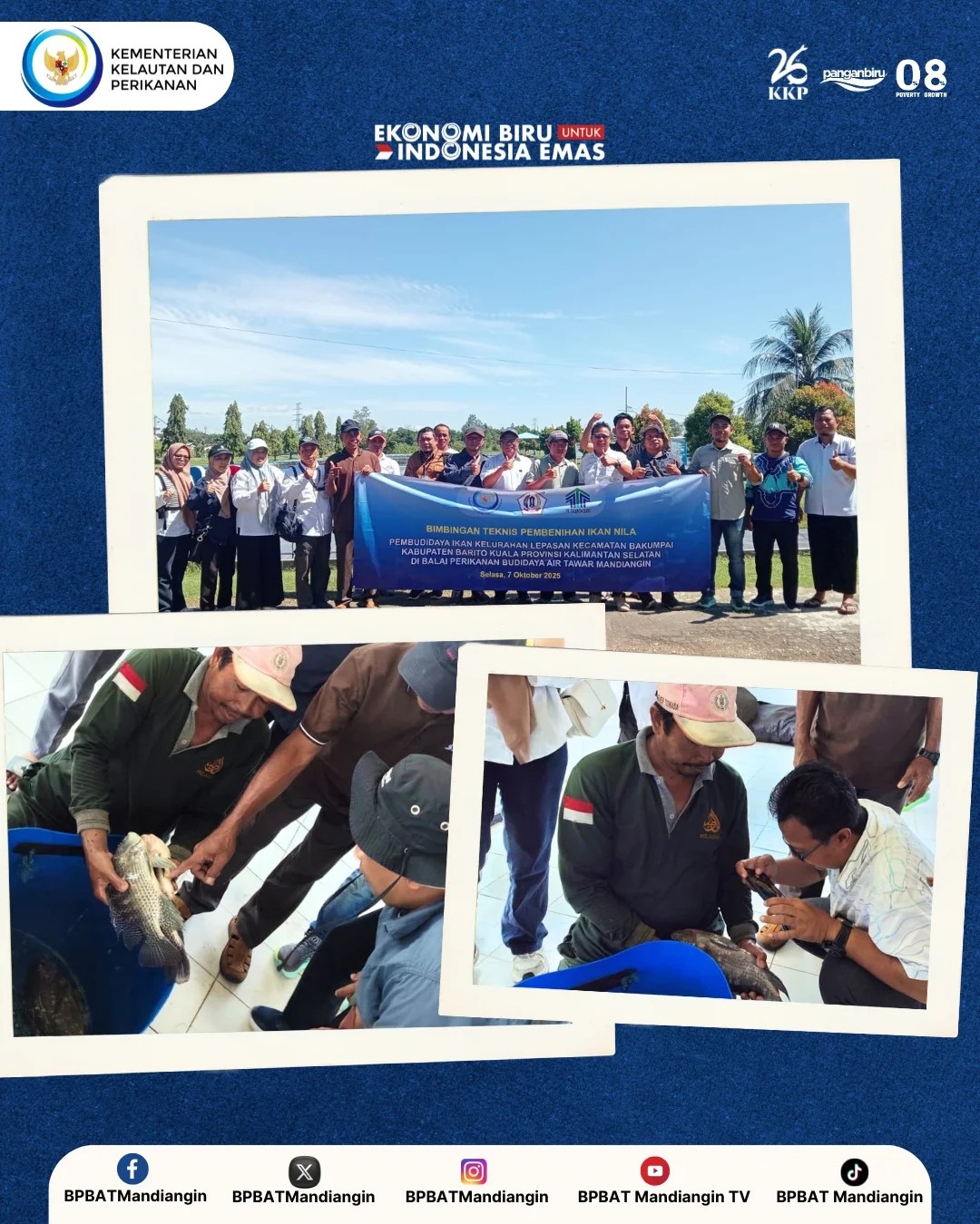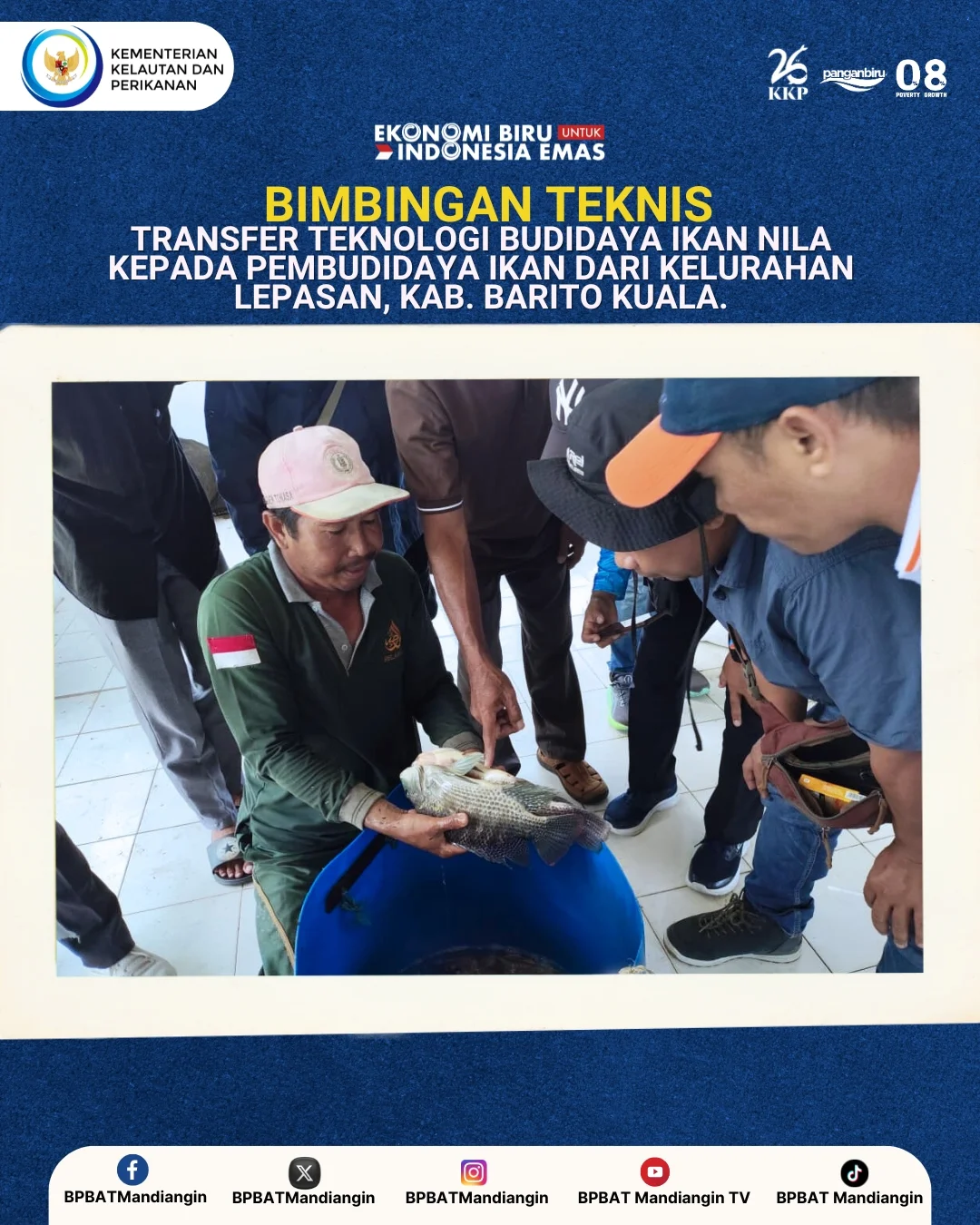 Hari ini Selasa (7/10/2025) Balai Perikanan Budidaya Air Tawar Mandiangin melalui Koordinator dan Tim Instalasi Bincau melaksanakan Bimbingan Teknis budi daya ikan Nila kepada pembudidaya ikan dari Kelurahan Lepasan, Kabupaten Barito Kuala, Kalsel.