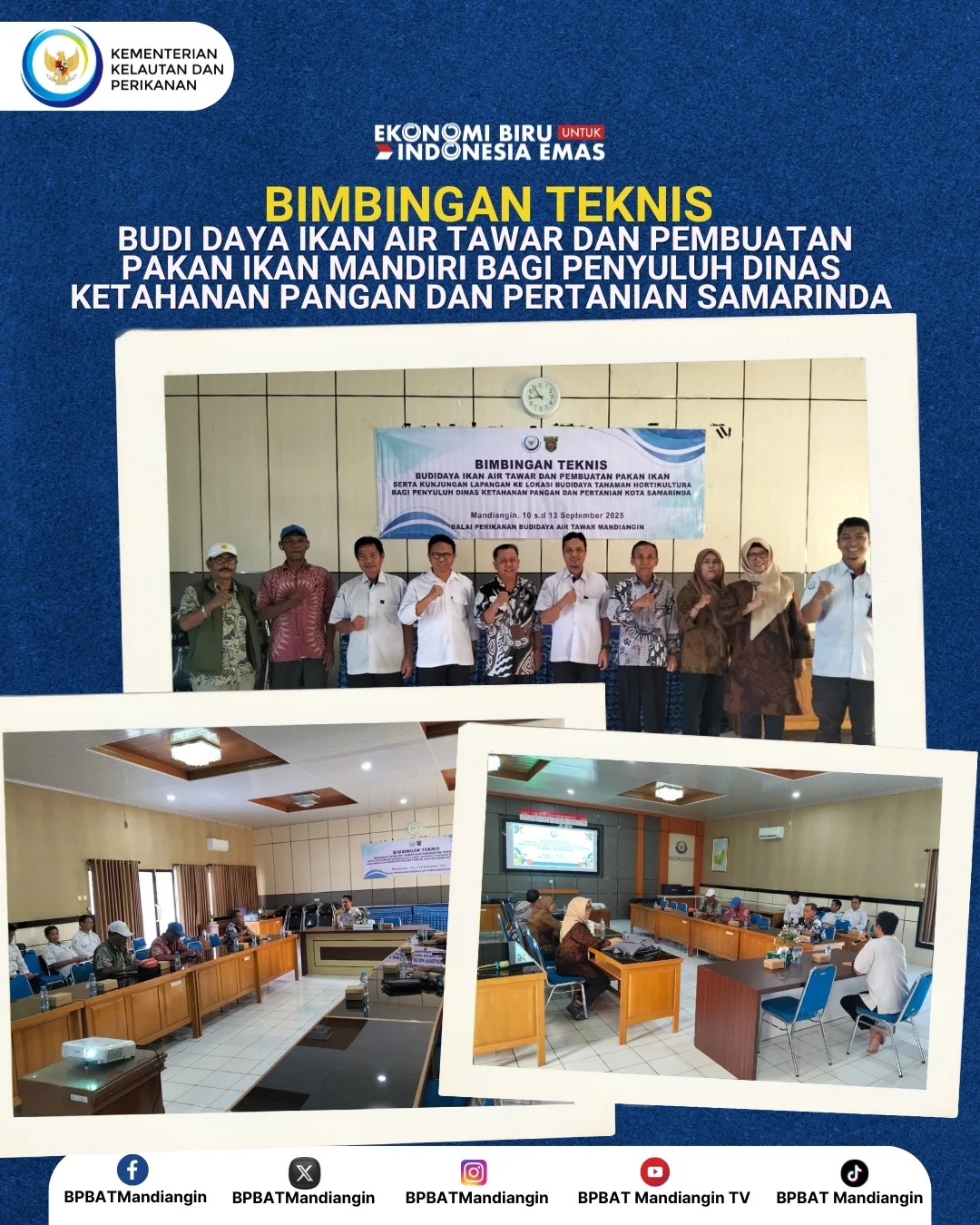 Kamis 11/9/2025, Balai Perikanan Budidaya Air Tawar Mandiangin melaksanakan kegiatan Bimbingan Teknis budi daya ikan air tawar dan pembuatan pakan ikan mandiri bagi Penyuluh Dinas Ketahanan Pangan dan Pertanian Kota Samarinda.
