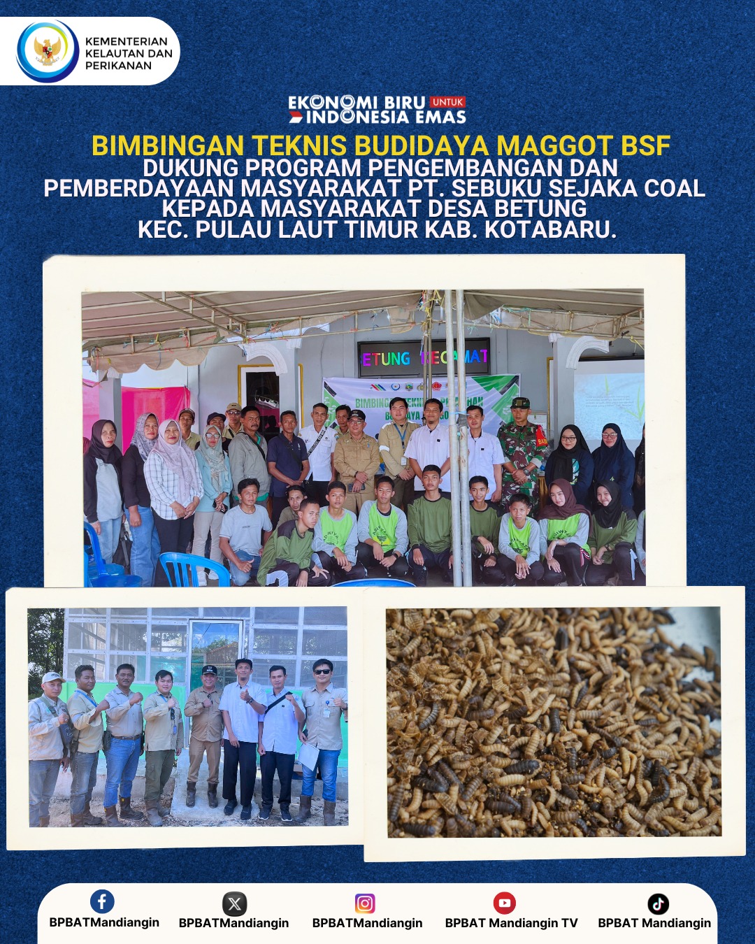 Kotabaru (23/09/2025), Balai Perikanan Budidaya Air Tawar Mandiangin melalui tim teknis budi daya Maggot BSF menjadi narasumber dalam kegiatan Bimbingan Teknis Budi daya Maggot dalam program Pengembangan dan Pemberdayaan Masyarakat yang dilaksanakan oleh PT. Subuku Sejaka Coal (SSC). Kegiatan ini diikuti oleh sejumlah masyarakat yang ada di Desa Betung Kecamatan Pulau Laut Timur Kabupaten Kotabaru.