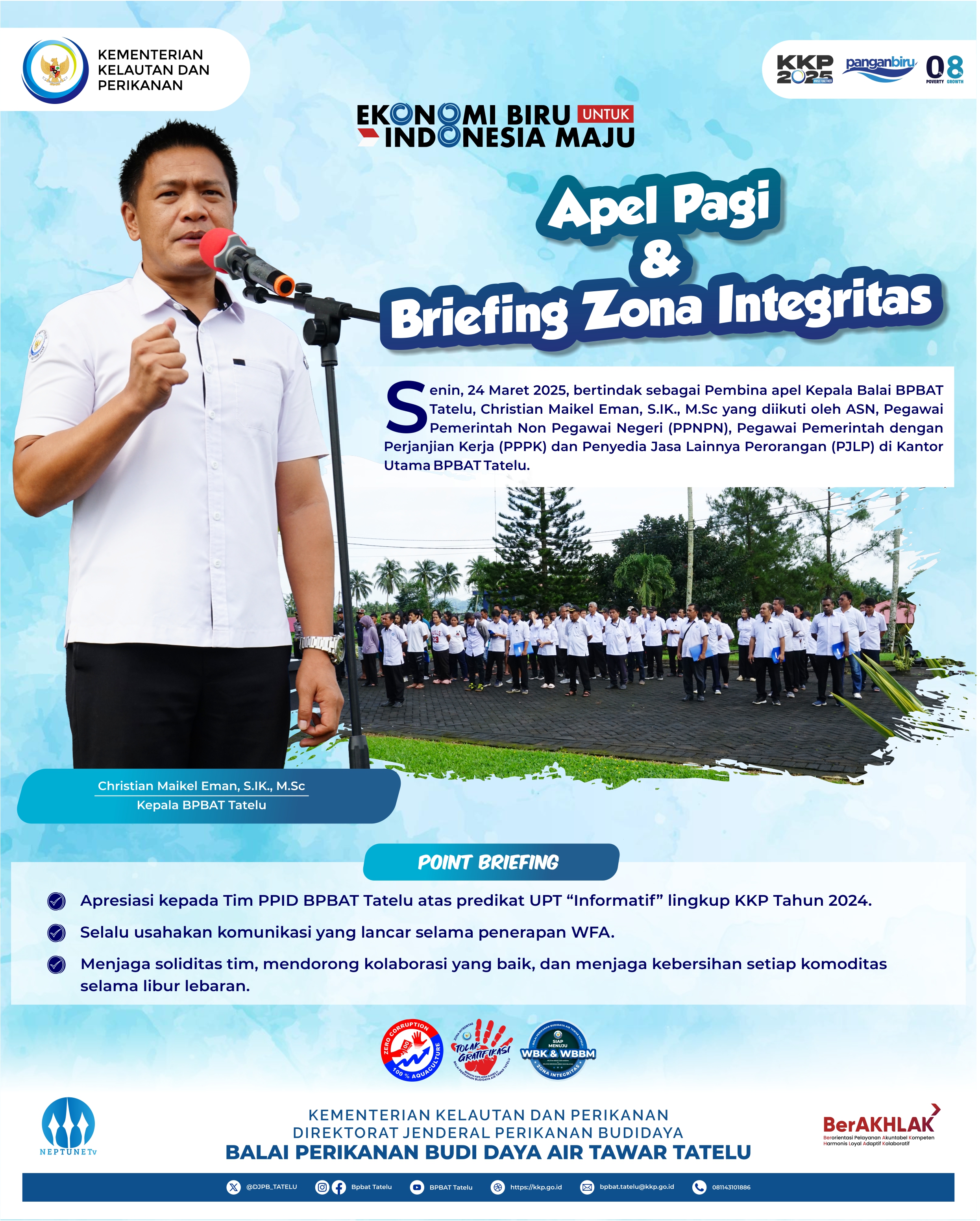 Apel Pagi dan Briefing Zona Integritas BPBAT Tatelu, Senin 24 Maret 2025