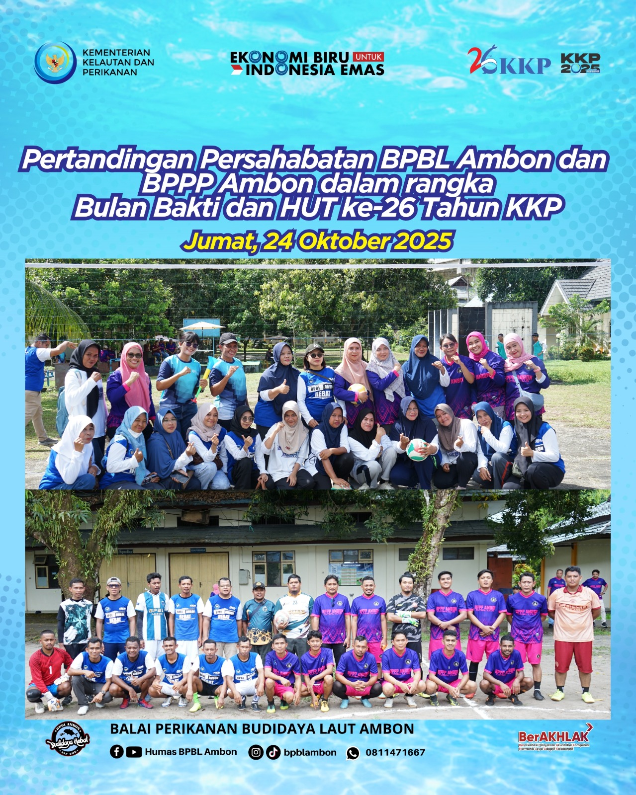 Masih dalam semangat Bulan Bakti dan HUT ke-26 Kementerian Kelautan dan Perikanan (KKP), BPBL Ambon dan BPPP Ambon menggelar pertandingan persahabatan yang seru meliputi voli putri, voli putra, dan sepak bola putra.
