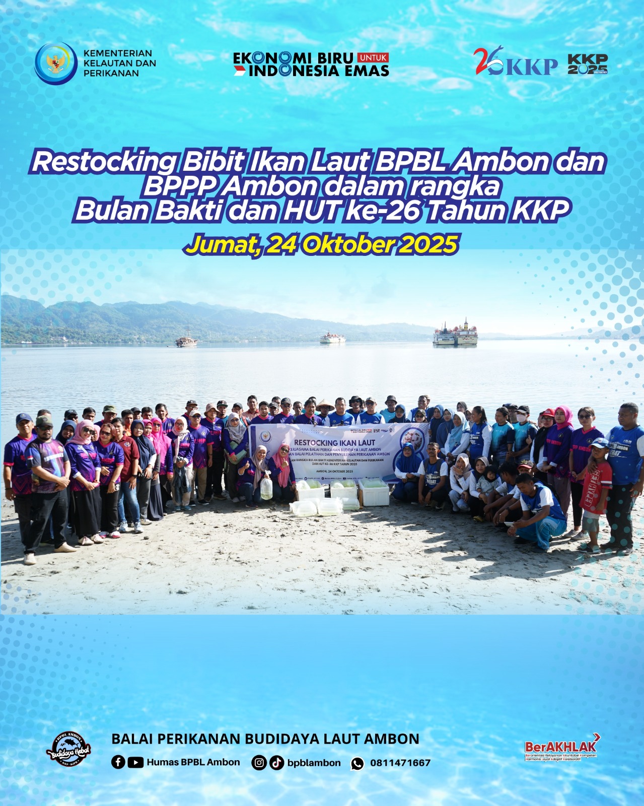 Dalam rangka Bulan Bakti Kementerian Kelautan dan Perikanan (KKP) serta HUT KKP ke-26, dua UPT KKP di Ambon, BPBL Ambon dan BPPP Ambon berkolaborasi melaksanakan kegiatan restocking ikan laut di perairan Teluk Ambon Dalam (Tanjung Marthafons).