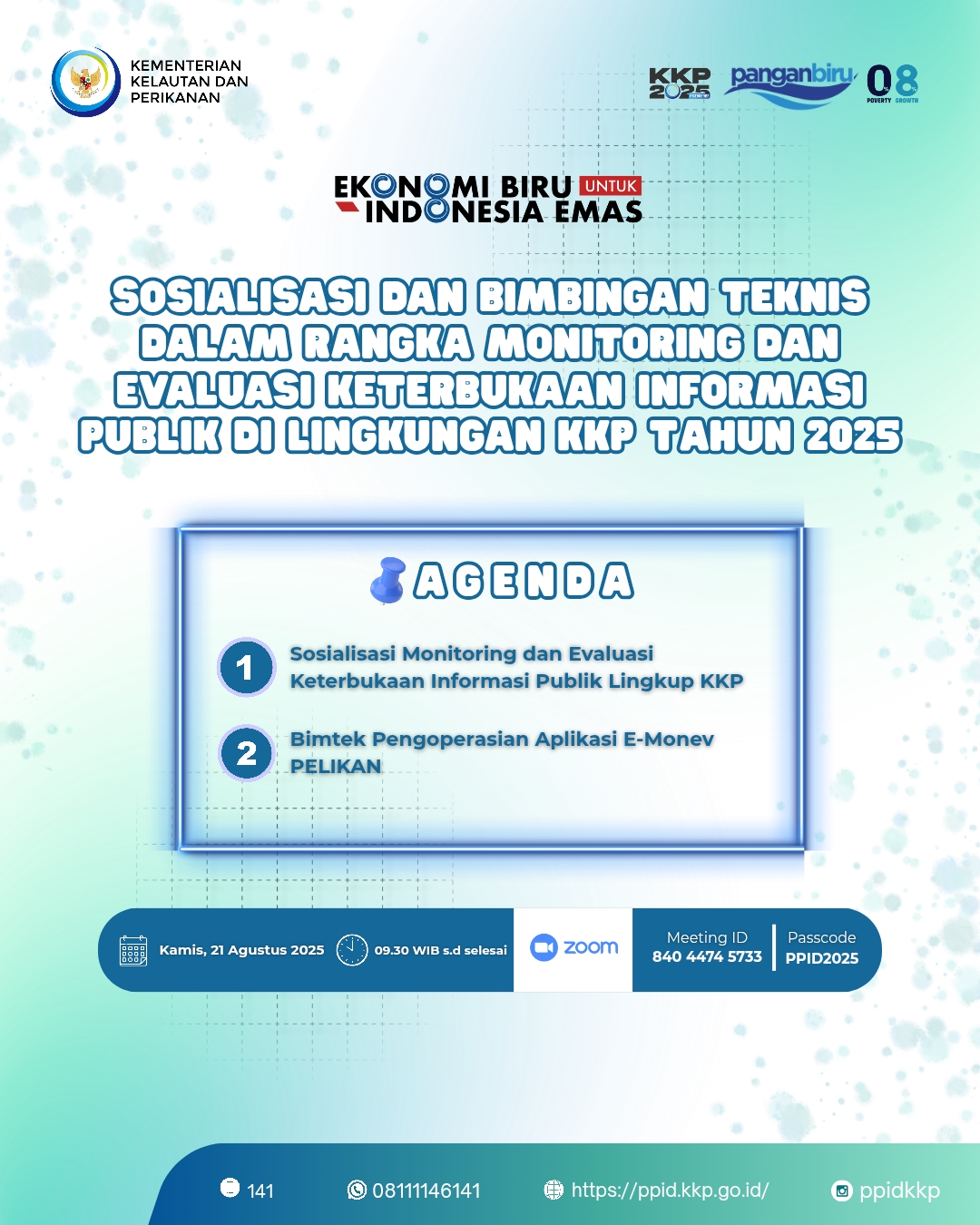 ๐ข Undangan untuk Bapak/Ibu! ๐ Kementerian Kelautan dan Perikanan mengundang PPID Pelaksana Lingkup KKP untuk hadir dalam Sosialisasi dan Bimbingan Teknis Monitoring dan Evaluasi Keterbukaan Informasi Publik di Lingkungan KKP Tahun 2025. ๐