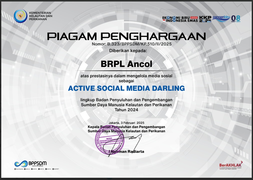 Balai Riset Perikanan Laut menerima penghargaan dalam pengelolaan media sosial di lingkungan Badan Penyuluhan dan Pengembangan Sumber Daya Manusia Kelautan dan Perikanan. Penghargaan bertajuk "Active Social Media Darling" tersebut diterbitkan pada tanggal 3 Februari 2025 oleh Kepala BPPSDM KP - Dr. I Nyoman Radiarta, untuk pencapaian atas pengelolaan media sosial tahun 2024.