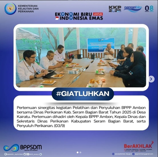 Pertemuan Sinergitas Kegiatan Pelatihan dan Penyuluhan Balai Pelatihan dan Penyuluhan Perikanan Bersama Dinas Perikanan Kabupaten Seram Bagian Barat Tahun 2025 di Desa Kairatu. Pertemuan dihadiri oleh Kepala Balai Pelatihan dan Penyuluhan Perikanan Ambon, Kepala Dinas dan Sekretaris Dinas Perikanan Kabupaten Seram Bagian Barat, serta Penyuluh Perikanan Kab. Seram Bagian Barat. Kepala Dinas Perikanan Kabupaten Seram Bagian Barat menyampaikan bahwa Dinas Perikanan mengapresiasi kegiatan Sinergitas ini dan berharap kedepan komunikasi kerja berjalan lebih baik lagi antara dinas perikanan dan penyuluh Perikanan. Kepala Balai Pelatihan dan Penyuluhan Perikanan Ambon menyampaikan arahan dan pembinaan yang intinya adalah : Transformasi tugas penyelenggaraan Penyuluhan harus berjalan dengan baik dalam mengawal 5 Program ekonomi biru yang menjadi program Prioritas KKP dan memajukan lokasi-lokasi yg menjadi sentra potensi dan produksi pd sektor Kelautan dan Perikanan yang ada di Kabupaten Seram Bagian Barat, karena itu koordinasi dan sinergitas yang baik antara penyuluh dengan dinas perikanan harus terus ditingkatkan dengan tujuan untuk meningkatkan kesejahteraan para pelaku utama KP.