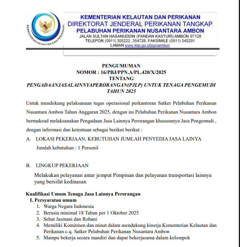 PENGUMUMAN PENGADAAN JASA LAINNYA PERORANGAN (PJLP) UNTUK TENAGA PENGEMUDI TAHUN 2025