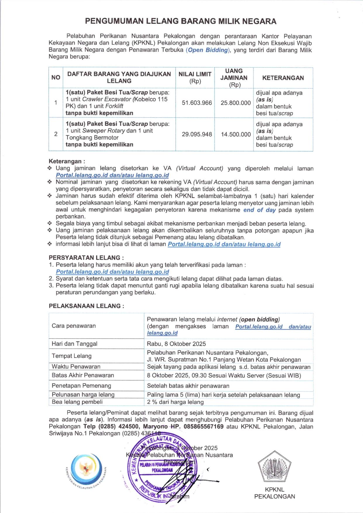 Pengumuman Lelang Alat Berat PPN Pekalongan