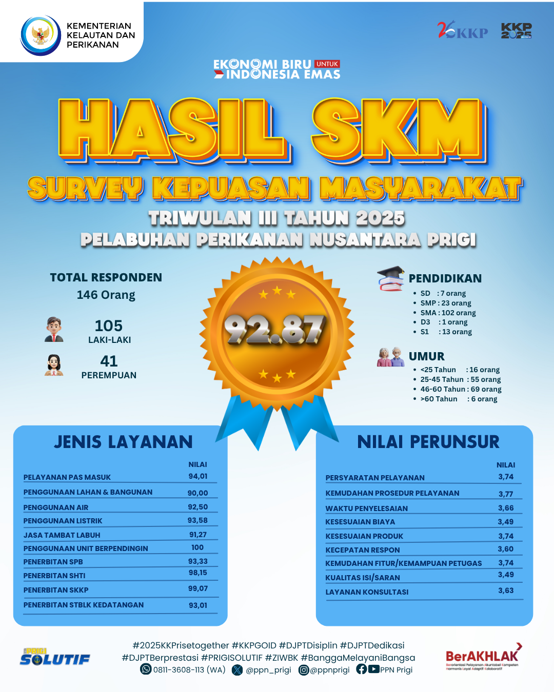 Berikut hasil akhir nilai Survey Kepuasan Masyarakat Triwulan III Tahun 2025 PPN Prigi.