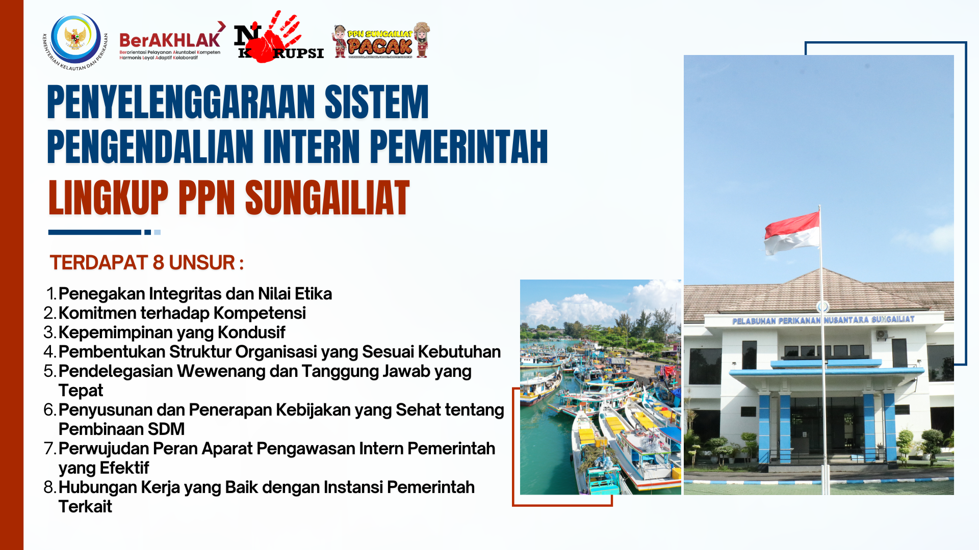 Dalam rangka mewujudkan tata kelola pemerintahan yang bersih, transparan, dan akuntabel, Pelabuhan Perikanan Nusantara (PPN) Sungailiat berkomitmen memperkuat penerapan Sistem Pengendalian Intern Pemerintah (SPIP) di seluruh unit kerja. Penerapan SPIP menjadi instrumen penting dalam memastikan bahwa setiap kegiatan instansi berjalan secara efektif, efisien, patuh terhadap peraturan, serta mampu memberikan manfaat optimal bagi masyarakat.