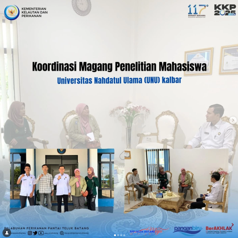 PPP Teluk Batang menerima kunjungan dari Universitas Nahdatul Ulama Kalimantan Barat, adapun tujuan dari kunjungan ini adalah untuk menempatkan mahasiswa dalam program penelitian serta penjajakan rencana pelaksanaan Memorandum Of Understanding (MOU) antara Universitas Nahdatul Ulama Kalimantan Barat dengan Pelabuhan Perikanan Pantai Teluk Batang.