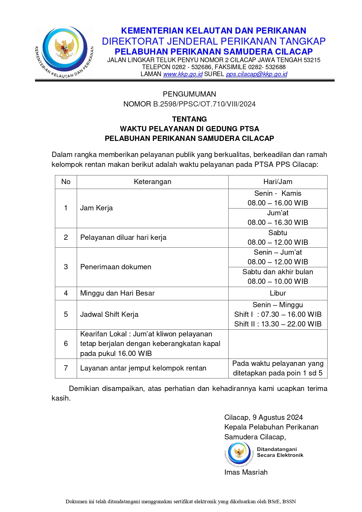 Waktu Pelayanan di Gedung PTSA PPS Cilacap