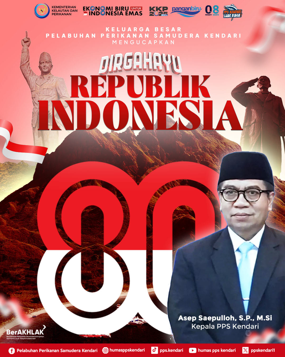 Pelabuhan Perikanan Samudera Kendari melaksanakan upacara peringatan Hari Ulang Tahun Kemerdekaan Republik Indonesia ke-80 yang berlangsung khidmat di dermaga PPS Kendari. Upacara ini dipimpin langsung oleh inspektur upacara, Kepala Pelabuhan Perikanan Samudera Kendari, serta diikuti oleh nelayan, pegawai pelabuhan, PSDKP, Balai Karantina, Pemerintah Daerah Kota Kendari Serta Satker lainnya. Jalannya upacara semakin meriah dengan hadirnya kurang lebih 21 kapal perikanan yang turut menghiasi dermaga sebagai simbol semangat kemerdekaan di laut.