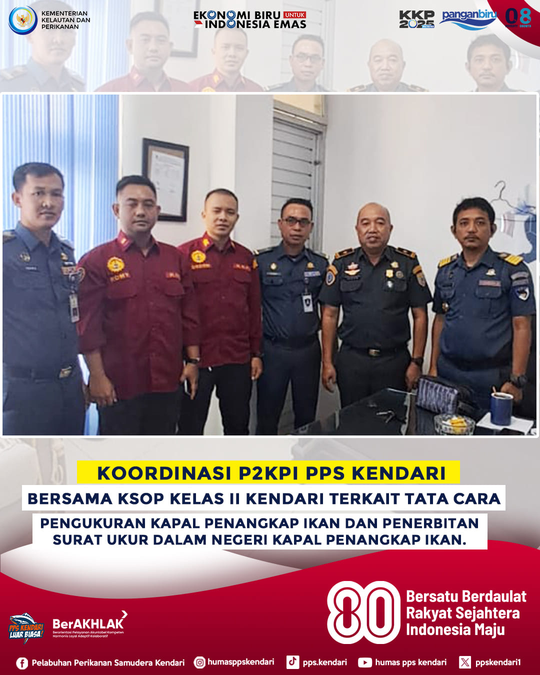 Sebagai tindak lanjut dari Surat Edaran Direktur Jenderal Perhubungan Laut Nomor SE/DJPL 23 Tahun 2025 tentang Tata Cara Pelaksanaan Pengukuran Kapal Penangkap Ikan dan Penerbitan Surat Ukur Dalam Negeri Kapal Penangkap Ikan Selama Masa Transisi, Tim P2KPI PPS Kendari melakukan koordinasi dengan KSOP Kelas II Kendari. Koordinasi ini bertujuan untuk menyamakan langkah serta memperjelas teknis pelaksanaan pengukuran kapal selama masa transisi kebijakan yang tengah berlangsung.