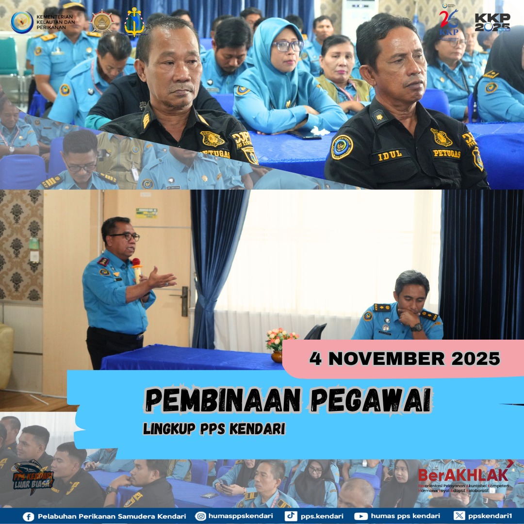 Pelabuhan Perikanan Samudera Kendari menggelar kegiatan pembinaan pegawai yang dipimpin langsung oleh Kepala PPS Kendari, serta dihadiri oleh Kasubag Umum, seluruh ketua tim kerja, dan seluruh pegawai PPS Kendari