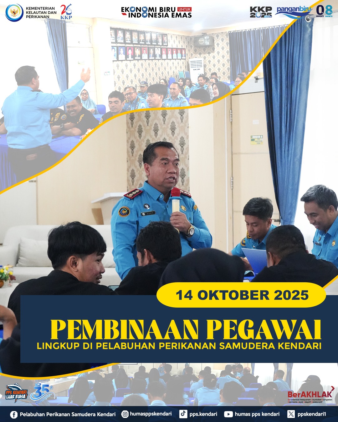 Pelabuhan Perikanan Samudera Kendari menggelar kegiatan pembinaan pegawai yang dipimpin langsung oleh Kepala PPS Kendari, serta dihadiri oleh Kasubag Umum, seluruh ketua tim kerja, dan seluruh pegawai PPS Kendari.