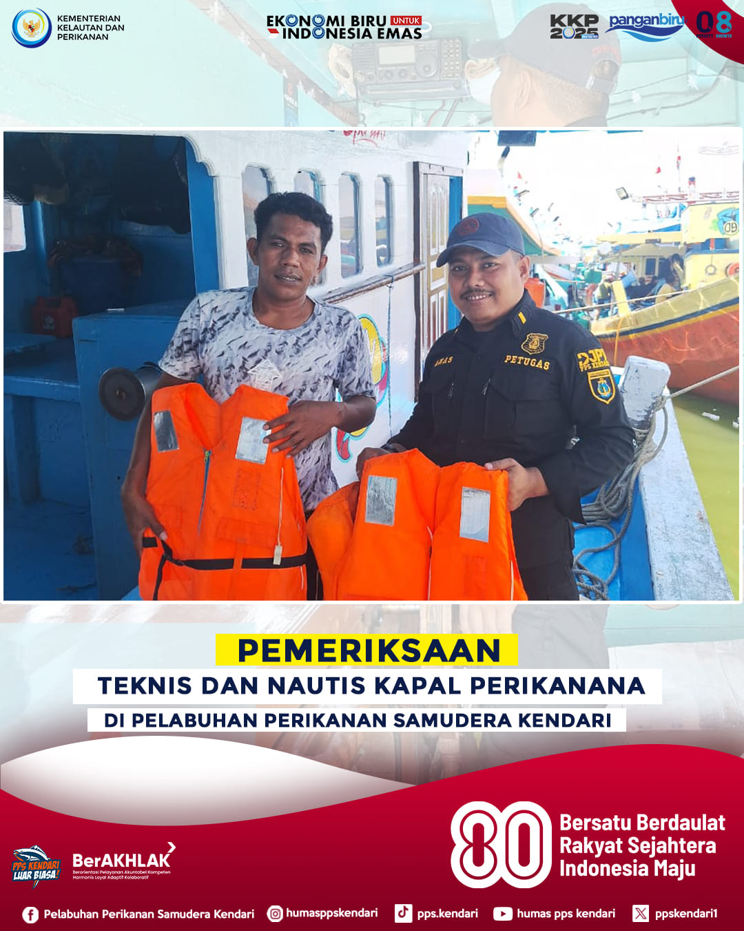 Tim Kerja Kesyahbandaran PPS Kendari melaksanakan pemeriksaan teknis dan nautis terhadap kapal perikanan yang beroperasi di wilayah pelabuhan. Pemeriksaan ini dilakukan untuk memastikan bahwa seluruh kapal memenuhi standar keselamatan pelayaran, mulai dari kelengkapan alat navigasi, kondisi mesin, hingga dokumen dan sertifikat kapal yang berlaku.