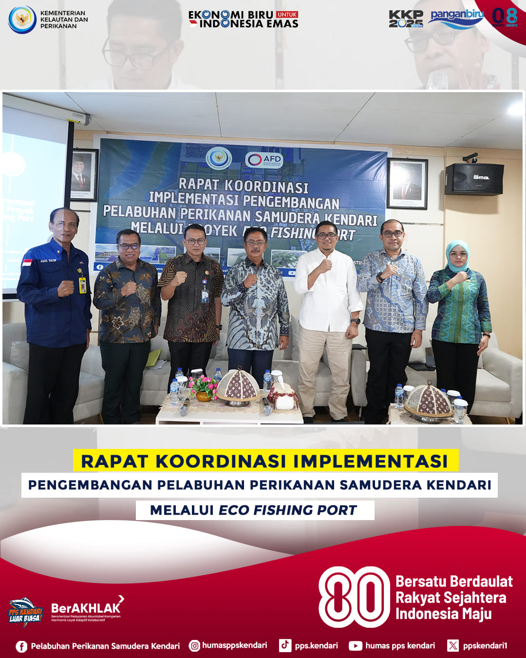 Pelabuhan Perikanan Samudera (PPS) Kendari menggelar rapat koordinasi implementasi proyek Eco Fishing Port yang dihadiri berbagai pemangku jabatan penting, di antaranya Komisi II Anggota DPR RI, Direktur Kepelabuhanan, Direktur Pengelolaan SDI, Kepala Dinas Kelautan dan Perikanan Provinsi Sulawesi Tenggara, Kepala dinas kota kendari, Tenaga Ahli KKP Bidang Perlindungan Nelayan dan Awak Kapal Perikanan, perwakilan AFD bersama tim TAO, serta pihak terkait lainnya. Kehadiran para pemangku kepentingan ini menunjukkan komitmen bersama dalam mendorong pelaksanaan proyek yang berorientasi pada pengelolaan pelabuhan yang ramah lingkungan dan berkelanjutan.