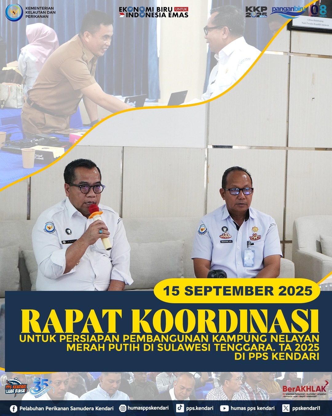 Pelabuhan Perikanan Samudera Kendari menjadi pusat penyelenggaraan pertemuan Tim Kampung Nelayan Merah Putih Sulawesi Tenggara, baik secara luring maupun daring. Kegiatan yang dibuka langsung oleh Kepala PPS Kendari ini menjadi langkah awal pelaksanaan Program Kampung Nelayan Merah Putih, program prioritas Presiden Republik Indonesia melalui Kementerian Kelautan dan Perikanan.