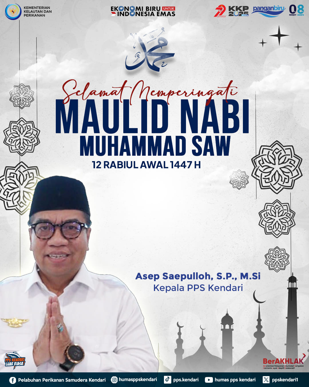Pelabuhan Perikanan Samudera Kendari mengucapkan "Selamat Memperingati Maulid Nabi Muhammad SAW 12 Rabi'ul Awal 1447 Hijriah".